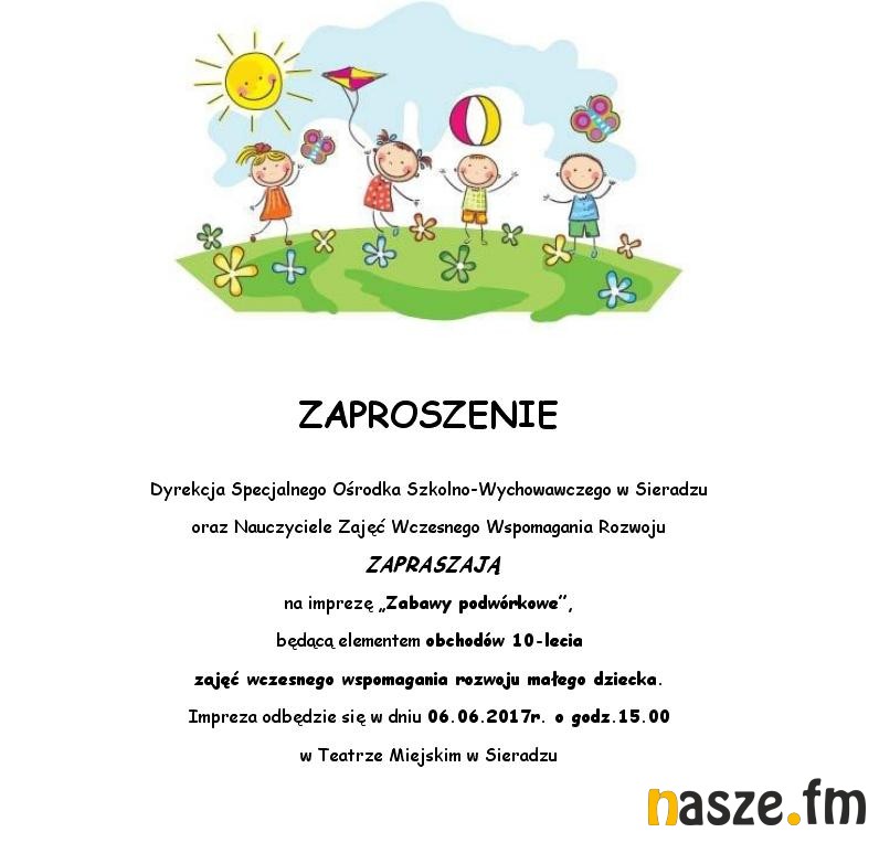 - W tym roku mija 10 lat odkąd Specjalny Ośrodek Szkolno- Wychowawczy w Sieradzu realizuje zajęcia wczesnego wspomagania, stąd to przedsięwzięcie. Najpierw poznacie historię naszych zajęć, nie zabraknie prezentacji i wystąpień zaproszonych gości. To będzie część oficjalna, następnie przeniesiemy się przed Teatr Miejski w Sieradzu, gdzie rozpoczną się "Zabawy podwórkowe", czyli twister, memory, klasy w formacie xxl. Będzie kącik malucha, bajkowe maskotki, wielkie bańki mydlane i mnóstwo innych atrakcji. Na koniec na deskach sieradzkiego teatru rozpocznie się przedstawienie " Pszczółka Maja i przyjaciele". W rolę aktorów, jak co roku wcielą się nauczyciele zajęć rewalidacyjno-wychowawczych z naszego ośrodka. Wstęp na to wydarzenie jest oczywiście wolny, serdecznie zapraszamy - mówi Agnieszka Sapiejka- Reichan, terapeuta zajęć wczesnego wspomagania w SOSW w Sieradzu.