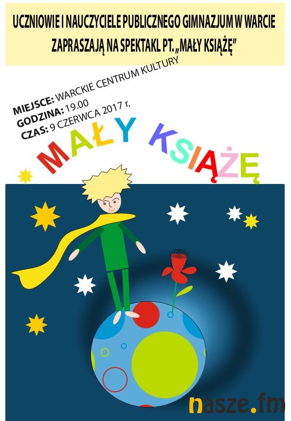 W najbliższy piątek (9.06) w Warckim Centrum Kultury uczniowie miejscowego gimnazjum wystawią sztukę Mały Książę. Początek tego wydarzenia o godzinie 19.