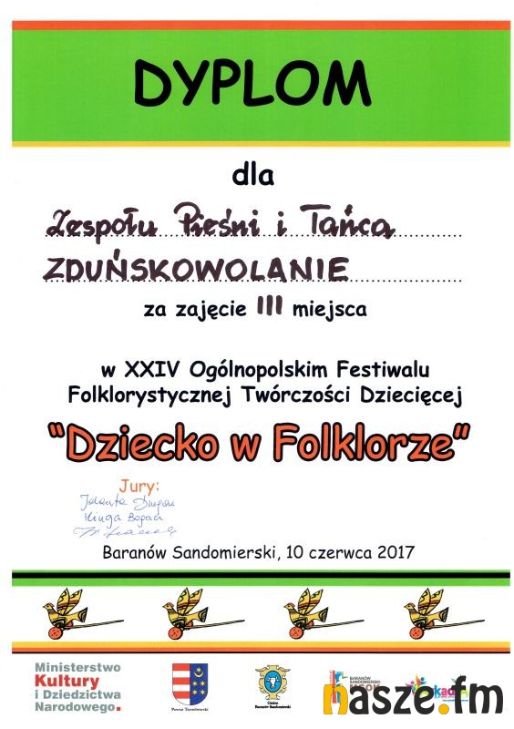 Najmłodsza grupa Zespołu Pieśni i Tańca "Zduńskowolanie" też zdobywa nagrody. Do Baranowa Sandomierskiego na XXIV Ogólnopolski Festiwal Folklorystycznej Twórczości Dziecięcej "Dziecko w Folklorze" przyjechało ponad 350 wykonawców.