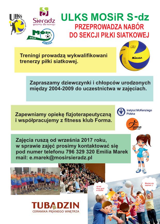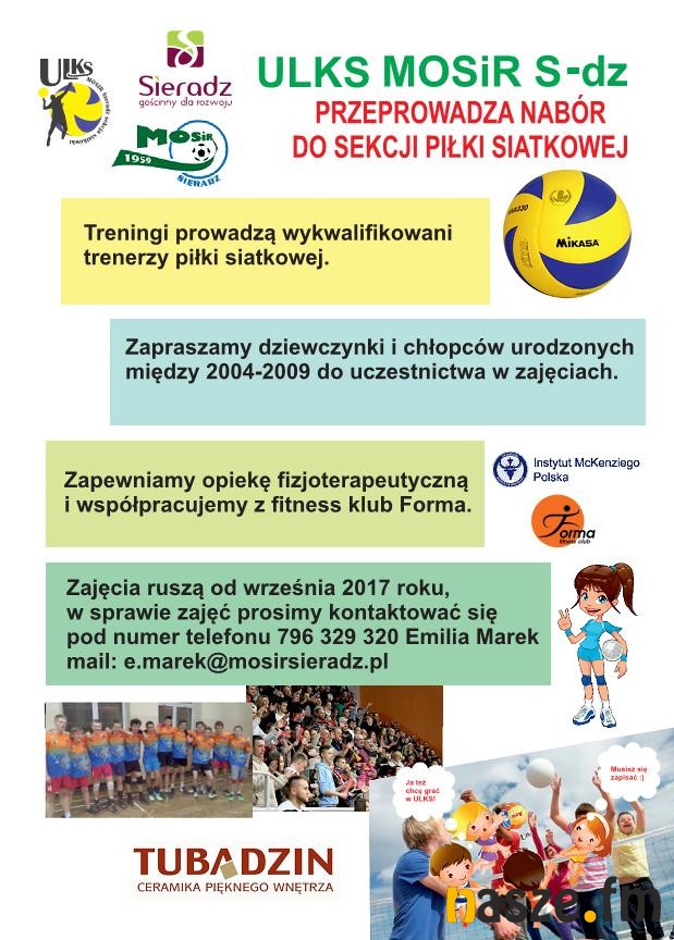 ULKS MOSiR Sieradz zaprasza na treningi młodych adeptów siatkówki, szczegóły na plakacie: