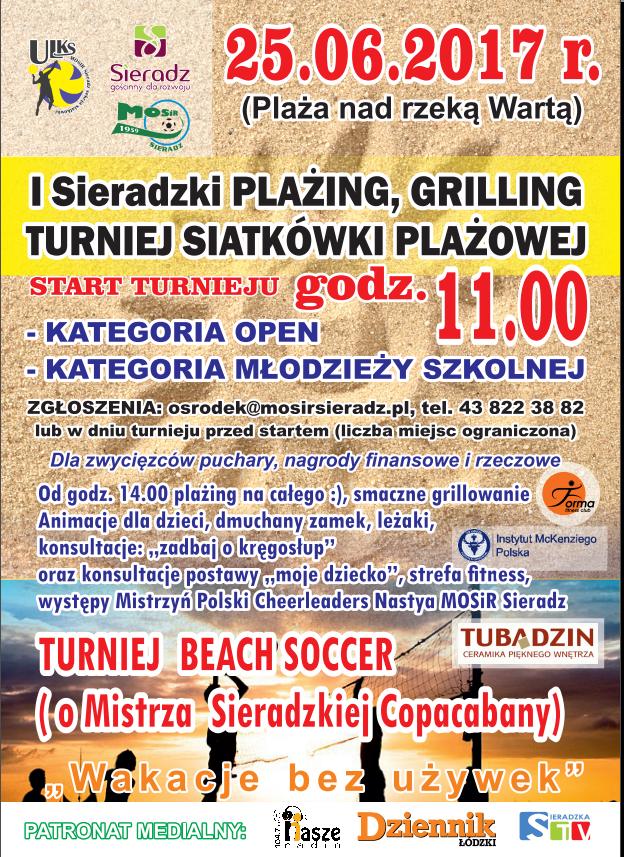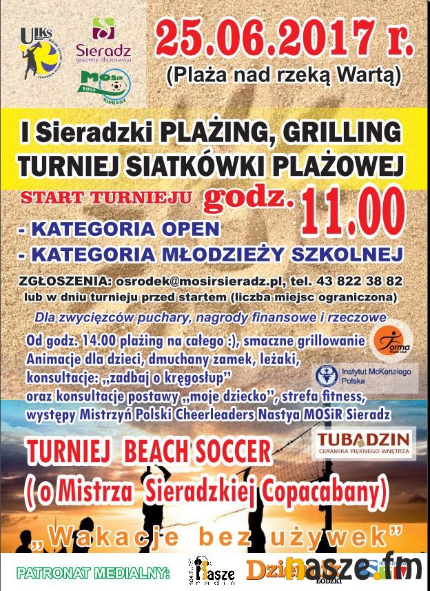 Na prawym brzegu Warty za mostem w Sieradzu trwają intensywne prace. Na znacznie powiększonej plaży odbędzie się już w niedzielę rodzinny piknik z turniejami: siatkówki plażowej i beach soccera. Turniej siatkarski zostanie rozegrany w kategoriach: młodzież szkolna i open. Zapisy przyjmuje sieradzki MOSiR (tel. 43 822 38 82, e-mail: osrodek@mosirsieradz.pl). Będzie też możliwość zgłoszeń bezpośrednio przed zawodami, ale ilość miejsc jest ograniczona.