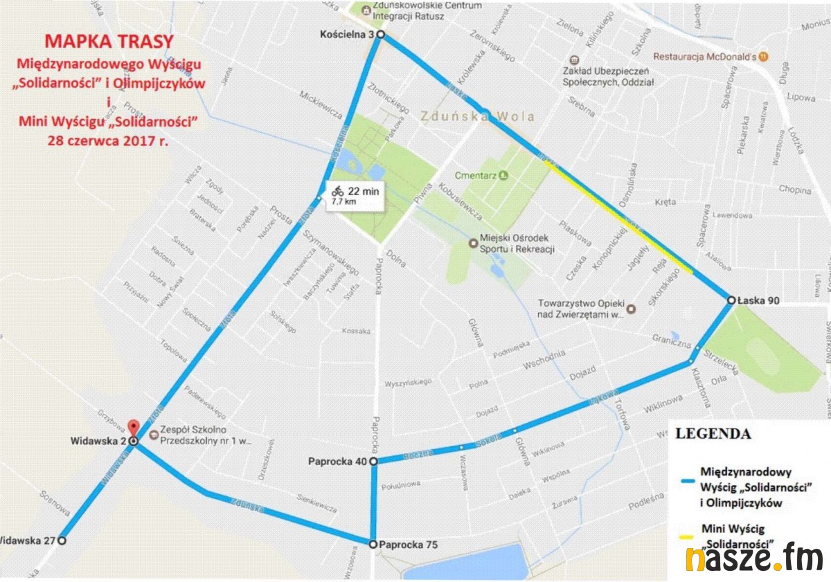 Dodatkowo ze względu na organizację 9. Mini Wyścigu "Solidarności" od godz. 9:00 do godz. 12:00 całkowicie zamknięta będzie ul. Łaska na odcinku od Spacerowej do Kilińskiego. Z kolei od godz. 12:30 do godz. 15:00 (dekoracja kolarzy) nieprzejezdny będzie odcinek ul. Łaskiej od Osmolińskiej do Kilińskiego.