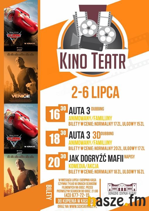 W sieradzkim Kinie Teatr będziecie mogli obejrzeć dwie produkcje filmowe: "Auta 3" oraz "Jak dogryźć mafii". W lipcu i sierpniu kasa kina będzie czynna tylko w dniach seansów filmowych godzinę przed pierwszym seansem, bilety będziecie mogli zakupić do godziny 21.