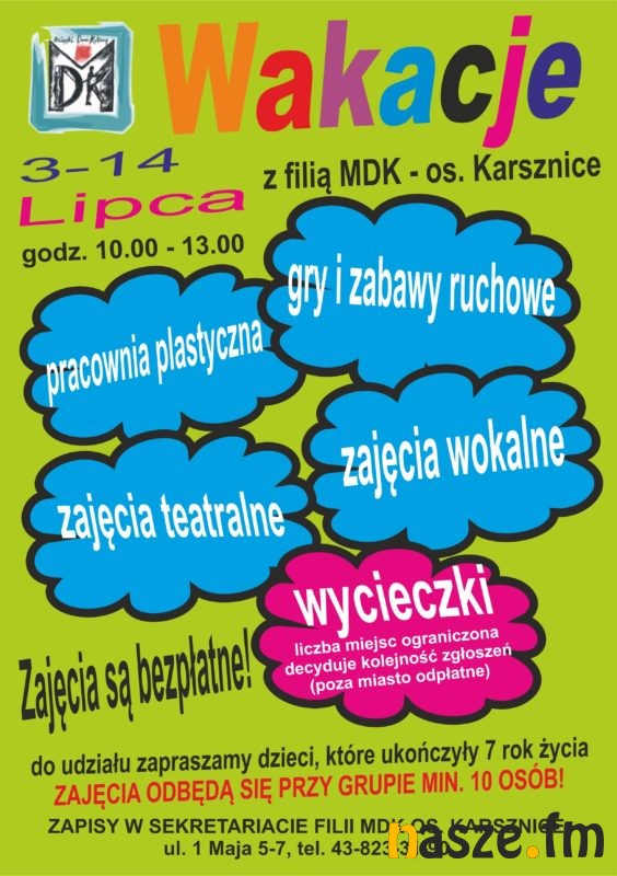 W filii Miejskiego Domu Kultury na osiedlu Karsznice wystartowały wakacyjne zajęcia. Dzieci powyżej 7 roku życia mogą z nich korzystać od poniedziałku do piątku w godzinach 10 – 13.