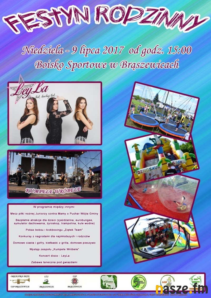W programie min. mecz piłki nożnej: juniorzy kontra mamy, pokaz boksu i kickboxingu oraz część koncertowa. Na estradzie wystąpią kapela Kumpele Wróbele oraz Leyla. Organizatorzy zapewniają też wesołe miasteczko dla najmłodszych oraz małą gastronomię. Całość zakończy dyskoteka pod gwiazdami. Festyn w Brąszewicach od godz. 15. Szczegóły na plakacie.