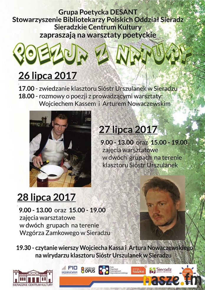 - Realizację projektu "Poezja z natury - warsztaty poetyckie" zaczynamy w środę 26 lipca. O godz. 17:00 zwiedzamy klasztor Sióstr Urszulanek w Sieradzu, które otworzyły dla poetów swój dom, poznamy historię tego miejsca, którą część sieradzan zna jedynie pobieżnie. O godz. 18:00 będziemy rozmawiać o poezji z prowadzącymi warsztaty: Wojciechem Kassem i Arturem Nowaczewskim. 27 lipca zajęcia warsztatowe rozpoczną się o godz 9:00 na terenie klasztoru Sióstr Urszulanek. Uczestników czeka praca zarówno pod okiem prowadzących, jak samodzielne zmagania z materią słowa. 28 lipca przeniesiemy się na Wzgórze Zamkowe i sieradzkie łęgi. Miejsca nie są wybrane przypadkowo. Podczas rozmów z Wojciechem Kassem wielokrotnie zastanawialiśmy się nad odwróceniem się współczesnego człowieka od natury, której jest przecież częścią. To wtedy wpadliśmy na pomysł zorganizowania warsztatów poetyckich w plenerze, właśnie w naturze.W piątek 28 lipca o 19.30 zapraszamy sieradzan na spotkanie z poezją Wojciecha Kassa i Artura Nowaczewskiego - zapowiada członkini Desantu.