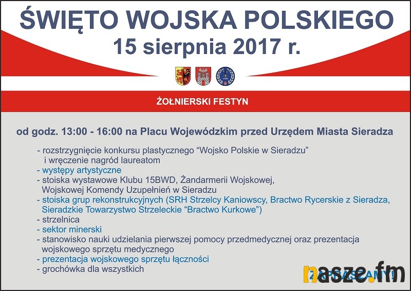 Z kolei o godz. 13 na placu przed Urzędem Miasta Sieradza rozpocznie się kilkugodzinny piknik wojskowy. W programie m.in. występy artystyczne, prezentacje grup rekonstrukcyjnych i sprzętu wojskowego.