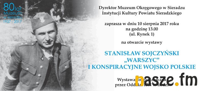 Dyrektor Muzeum Okręgowego w Sieradzu zaprasza w dniu 10 sierpnia 2017 roku na godzinę 13:00 (ul. Rynek 1) na otwarcie wystawy Stanisław Sojczyński Warszyc i konspiracyjne Wojsko Polskie.
