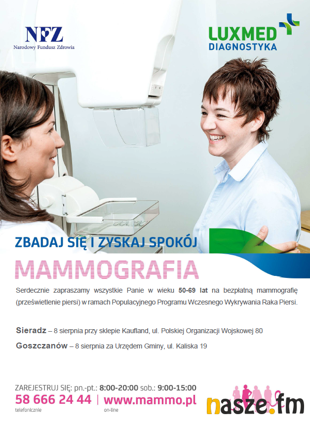 Mammografię można będzie wykonać w mammobusie na parkingu przy sieradzkim sklepie Kaufland oraz w Goszczanowie przy ul. Kaliskiej za Urzędem Gminy od godz. 9.