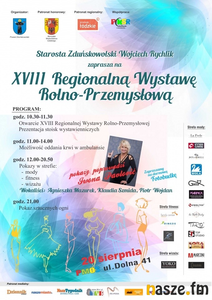 Powiat zduńskowolski zaprasza do udziału w XVIII Regionalnej Wystawie Rolno-Przemysłowej. Impreza w najbliższą niedzielę (20.08) odbędzie się na terenie PMOS-u przy ul. Dolnej 41. W podróż po świecie mody, wizażu i fitnessu zabierze wszystkich m.in. Iwona Pavlović.
