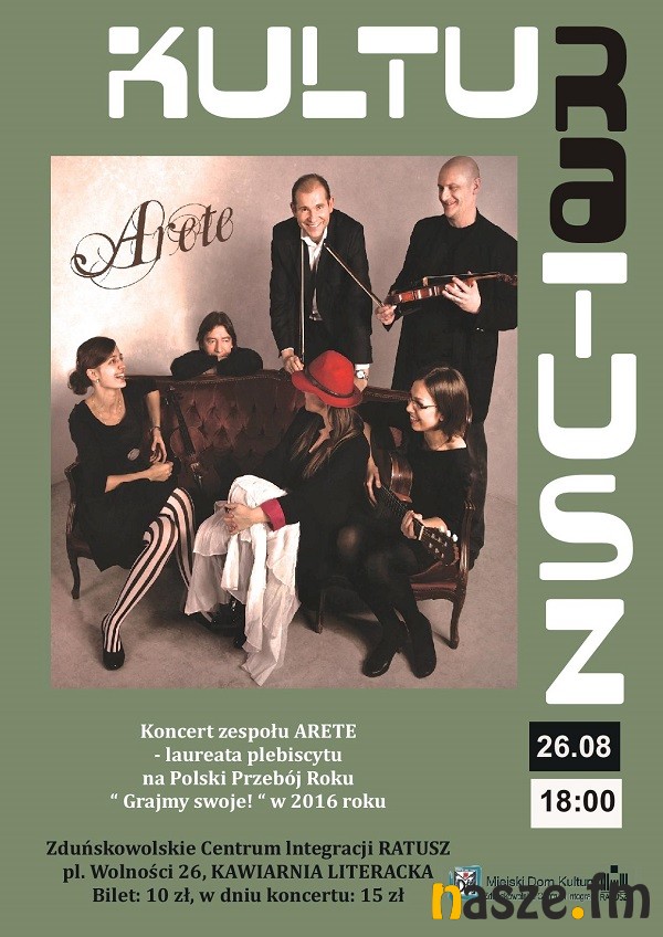 Miejski Dom Kultury w Zduńskiej Woli zaprasza na kolejny koncert z cyklu Kulturatusz. Wystąpi zespół ARETE, laureat plebiscytu na Polski Przebój Roku "Grajmy swoje!" w 2016 r.