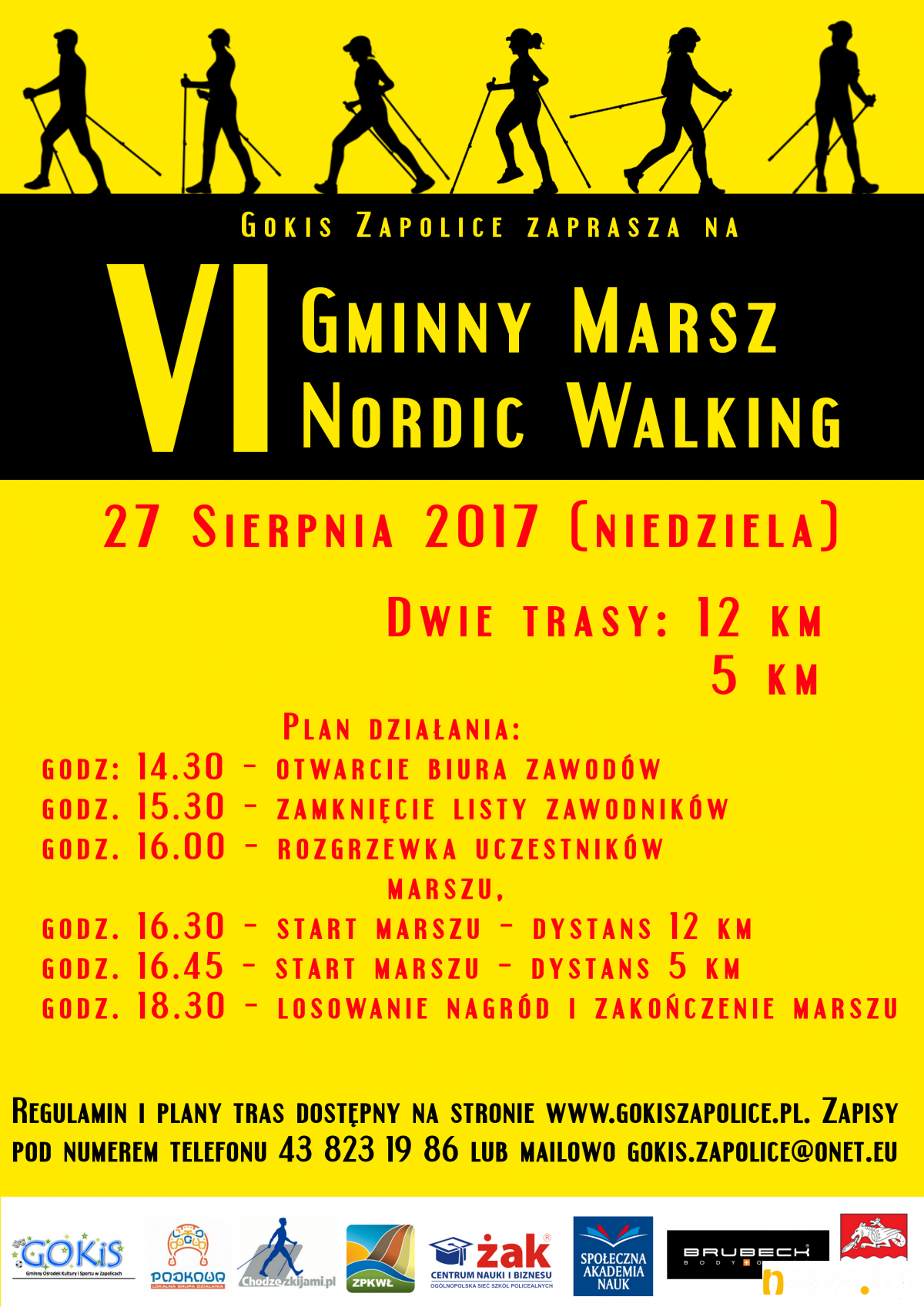 Gminny Ośrodek Kultury i Sportu w Zapolicach zaprasza na 6. edycję Gminnego Marszu Nordic Walking - Zapolice 2017. Impreza odbędzie się w niedzielę 27 sierpnia. Biuro zawodów będzie usytuowane w Parku Wiejskim w Strońsku.
