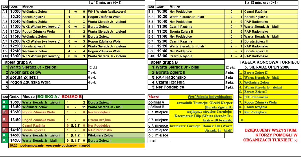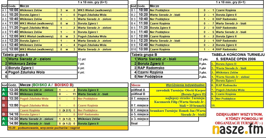 Warta wystawiła dziś dwie drużyny, obydwie wygrały swoje grupy eliminacyjne. Do finału awansowała ekipa białych, która po remisie 0:0 ostatecznie uległa Borucie w rzutach karnych. Druga drużyna sieradzan (zieloni) przegrała brązowe medale także w rzutach karnych po remisie z Włókniarzem Zelów 1:1.