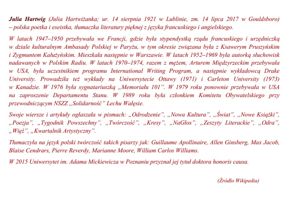 - wykład Ewy Jaśkiewicz na temat życia i twórczości Julii Hartwig, której utwory czytać będą sieradzcy dziennikarze,