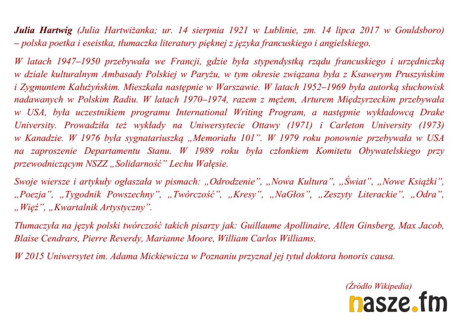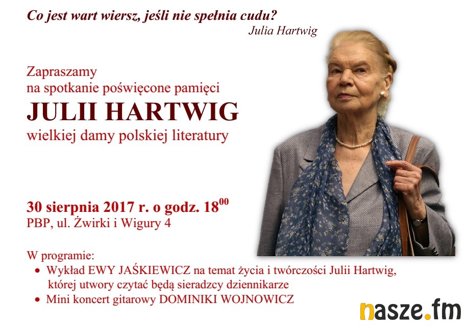 Powiatowa Biblioteka Publiczna w Sieradzu (ul. Żwirki i Wigury 4) zaprasza na spotkanie poświęcone pamięci Julii Hartwig. O wielkiej damie polskiej literatury i jej twórczości w środę 30 sierpnia opowie Ewa Jaśkiewicz. Początek o godz. 18:00,wstęp wolny.