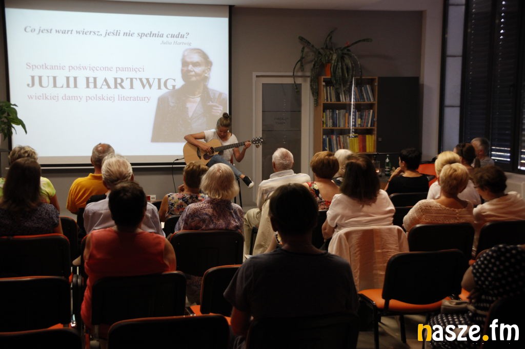 Prelekcja nie była nudnym wykładem o życiu i twórczości Julii Hartwig, ale pełną emocji opowieścią o jej barwnym życiu i licznych osiągnięciach. Nie zabrakło pokazu zdjęć z różnych okresów życia autorki. Teksty poetki czytały sieradzkie dziennikarki; Joanna Chachuła i nasza redakcyjna koleżanka, Monika Waraczyńska. Publiczność podziwiała też talent młodej sieradzkiej,gitarzystki. Dominika Wojnowicz wykonała kilka utworów skomponowanych przez Romualda Erenca.