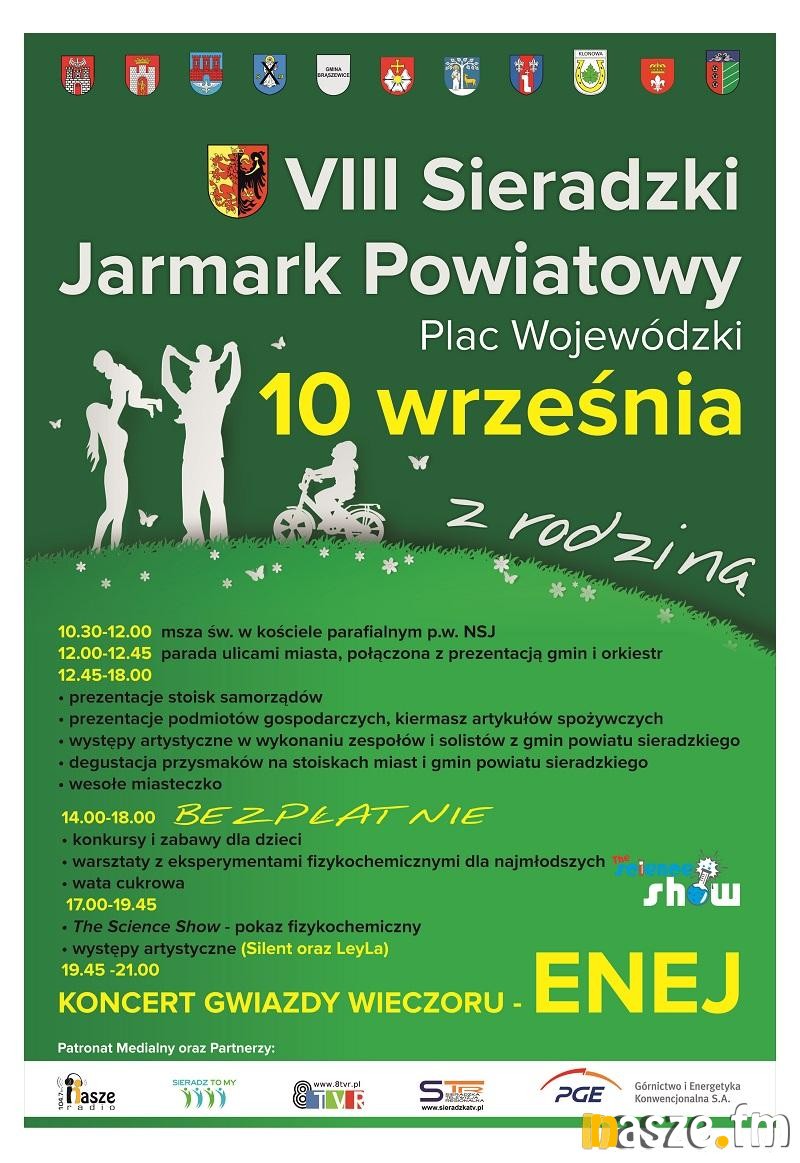 Jarmark poprzedzi msza św. w kościele pw. Najświętszego Serca Jezusowego na os. Jaworowym. Uczestnicy przejdą stamtąd ulicami miasta przed gmach starostwa. Jak co roku zaprezentują się w ten sposób wszystkie gminy z terenu powiatu sieradzkiego. Na odwiedzających jarmark będą czekały stoiska poszczególnych samorządów; gminy będą w ten sposób prezentowały swój dorobek i atrakcje, którymi kuszą turystów czy letników. Oczywiście będzie też można liczyć na różne smakołyki serwowane przez koła gospodyń wiejskich. Na najmłodszych czekać będzie wesołe miasteczko. Nowością na jarmarku będzie The Science Show, czyli pokaz fizykochemiczny. Gwiazdą wieczoru będzie zespół Enej (godz. 19.45). Uwaga, w związku z organizacją wydarzenia kierowcy muszą liczyć się z utrudnieniami w ruchu w obrębie pl. Wojewódzkiego, który będzie zamknięty na czas organizacji imprezy.