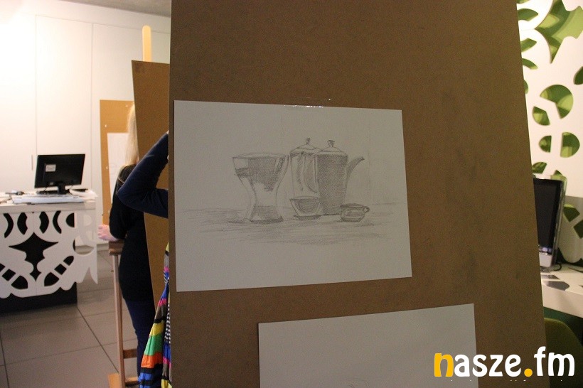 Każdy z uczestników na swojej sztaludze miał narysować martwą naturę. Część osób była już kolejny raz. Byli też tacy dla których wczorajsze warsztaty były pierwszym spotkaniem ze sztuką rysunku: