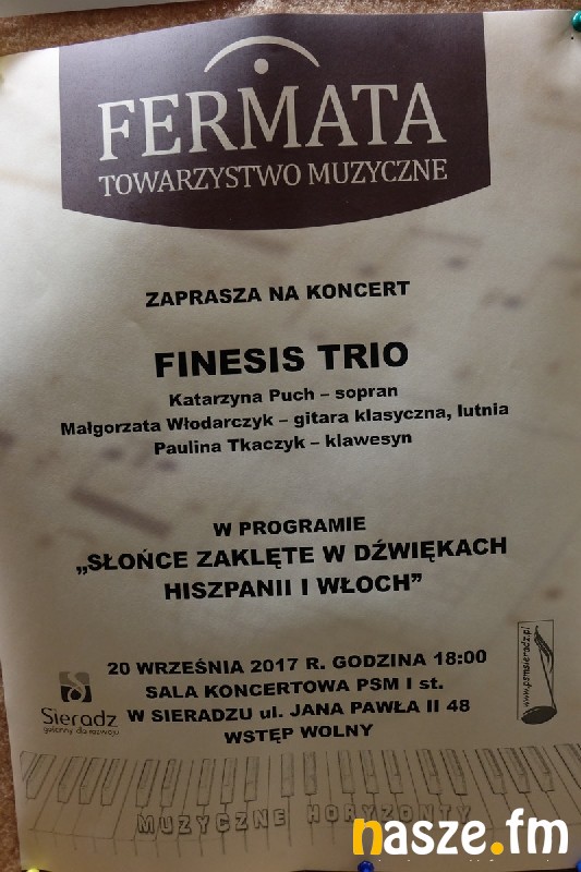 - Melomani mogli ogrzać się w promieniach słońca, a to za sprawą programu przedstawionego przez Finesis Trio ( w skład zespołu wchodzą Katarzyna Puch - sopran, Małgorzata Włodarczyk - gitara i lutnia oraz Paulina Tkaczyk - klawesyn) . Klawesyn i lutnia to instrumenty, które bardzo rzadko widzimy i słyszymy podczas koncertów odbywających się w Sieradzu. Pięknie zabrzmiał klawesyn będący repliką flamandzkiego klawesynu Andreasa Ruckersa z 1637 r. Równie dobrze brzmiała lutnia i gitara w rękach pani Małgorzaty Włodarczyk. Pojawiły się zapowiadane muzyczne perełki, a były nimi choćby pieśni hiszpańskie ze zbioru Musica Barocca Espanola, które z wielką gracją i wdziękiem interpretowała pani Katarzyna Puch. Pieśni z tego zbioru wykonywane są niezmiernie rzadko, a w Polsce ten repertuar wykonuje tylko Finesis Trio. W Sieradzu instrumentalistki Małgorzata Włodarczyk i Paulina Tkaczyk wykonały po raz pierwszy Sonatę VI C - dur Tommasa Giordaniego, która od teraz na stałe wejdzie do programu zespołu. Chaconna F - dur Jaquesa Duphly'ego wywarła na słuchaczach silne wrażenie brawurowo wykonana przez Paulinę Tkaczyk. Uczniowie szkoły muzycznej, jak również wszyscy obecni na koncercie mogli dowiedzieć się wielu ciekawostek - o każdym kompozytorze i utworze, padło kilka słów wprowadzających, teksty pieśni zostały przetłumaczone. Omówione zostały również różnice między współczesną a hiszpańską i angielską gitarą - relacjonuje Sławomir Cieślak, prezes Towarzystwa Muzycznego Fermata, które koncert zorganizowało.