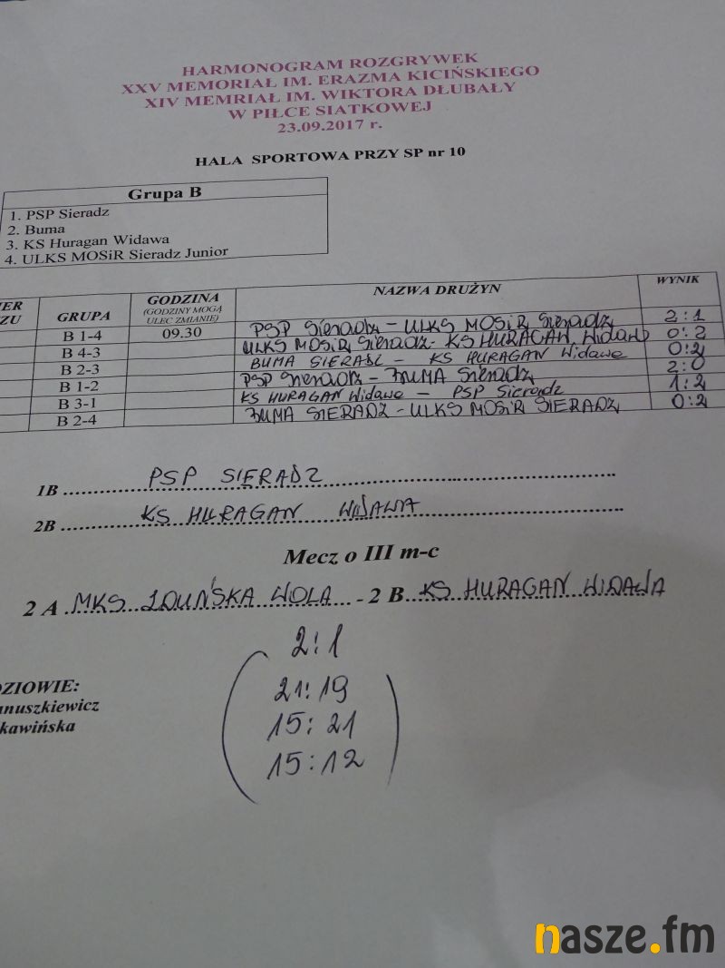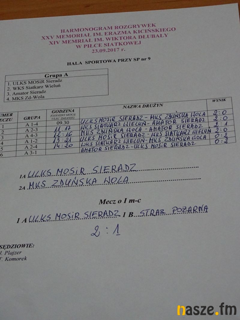 Dziś w Sieradzu odbył się XXV Memoriał im. Erazma Kicińskiego oraz XIV Memoriał im. Wiktora Dłubały w piłce siatkowej w kat. OPEN. Pierwsze miejsce zajęła drużyna ULKS MOSiR Sieradz, tuż przed zespołem PSP Sieradz. Trzecie miejsce zajął MKS Zduńska Wola.