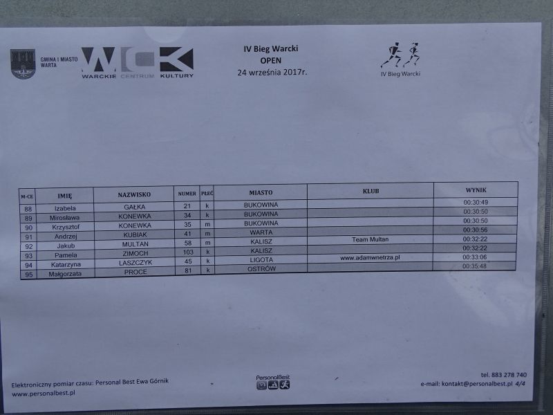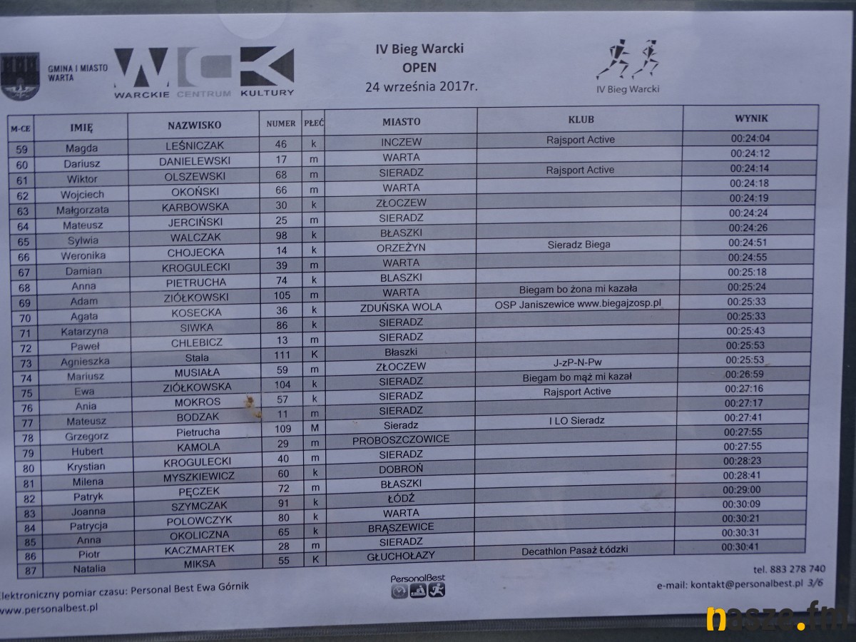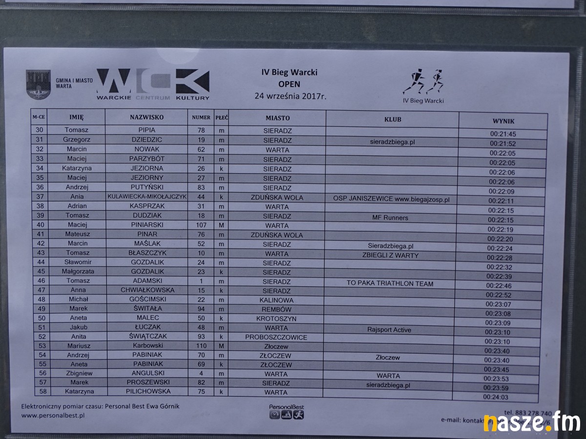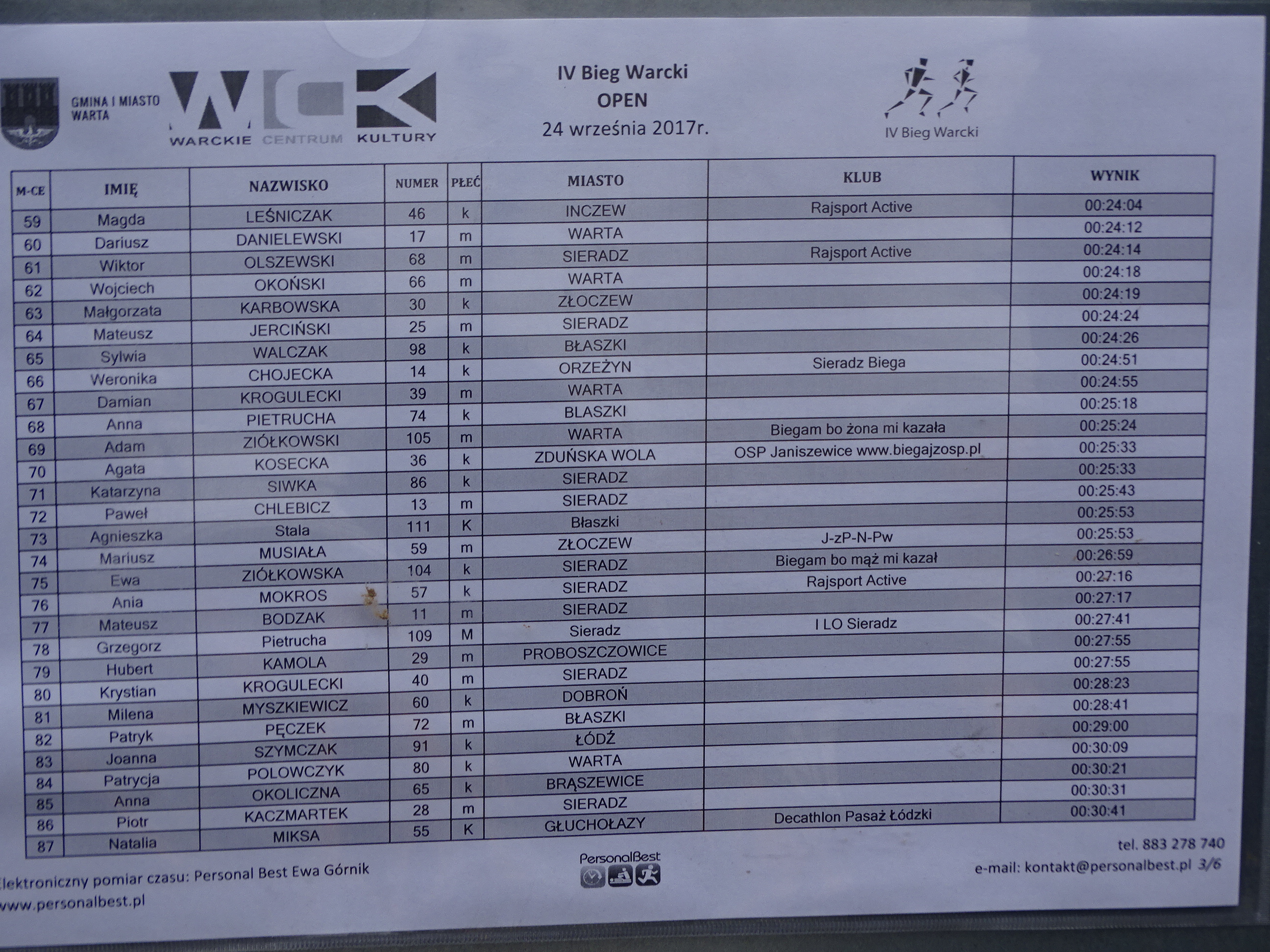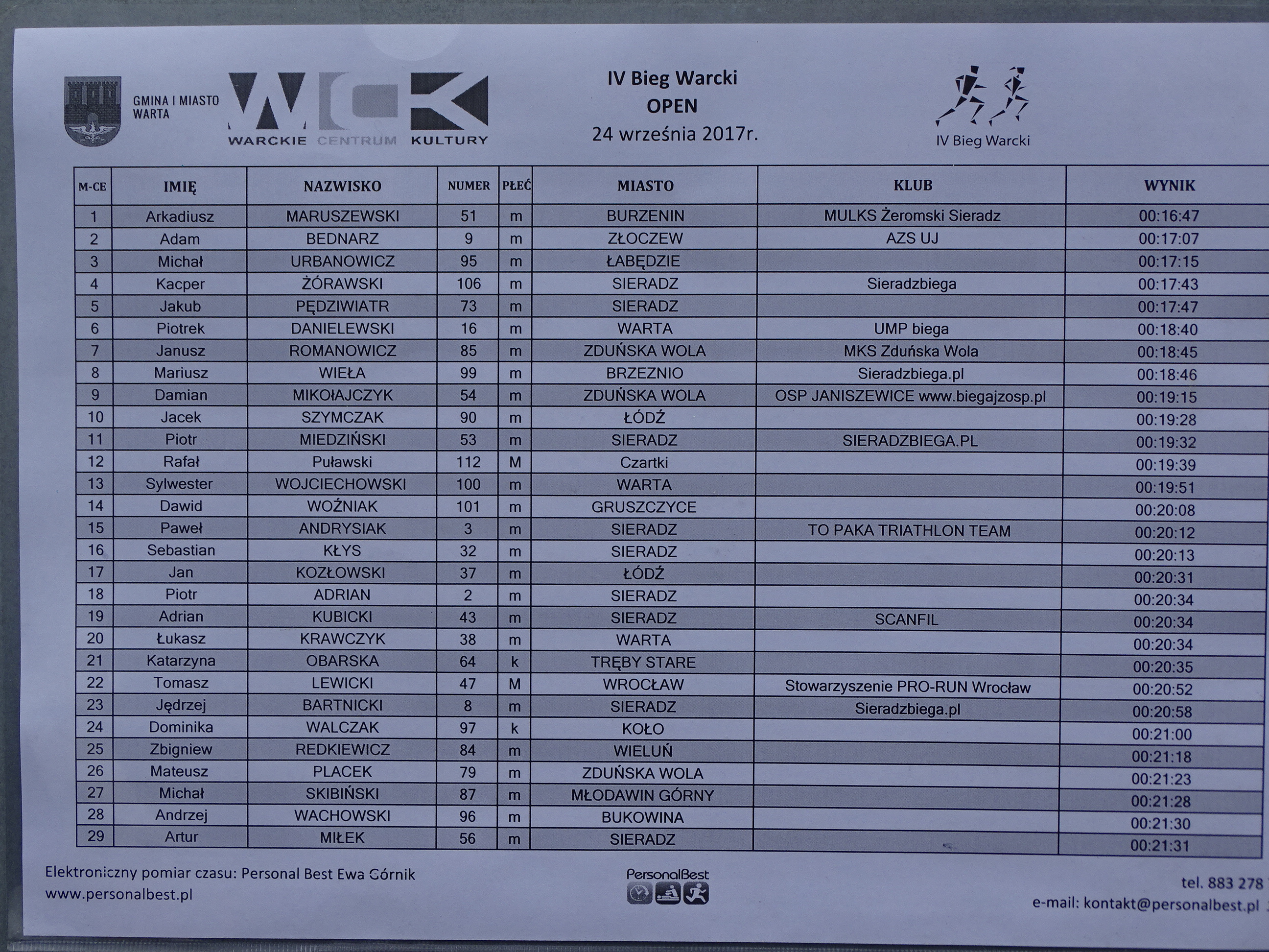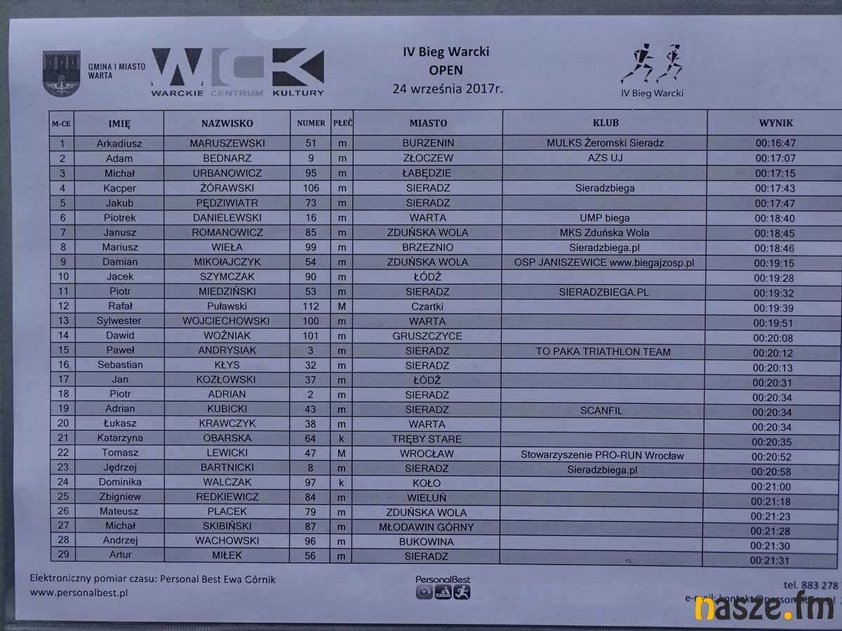 Dziś odbyła się czwarta edycja Biegu Warckiego. Na starcie stanęło 95 zawodników. Wygrał Arkadiusz Maruszewski z Burzenina, który reprezentował barwy MULKS Żeromski Sieradz. Trasę 5 km po ulicach miasta pokonał w czasie 16:47.