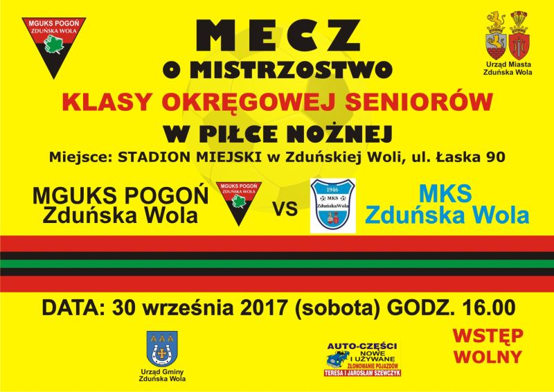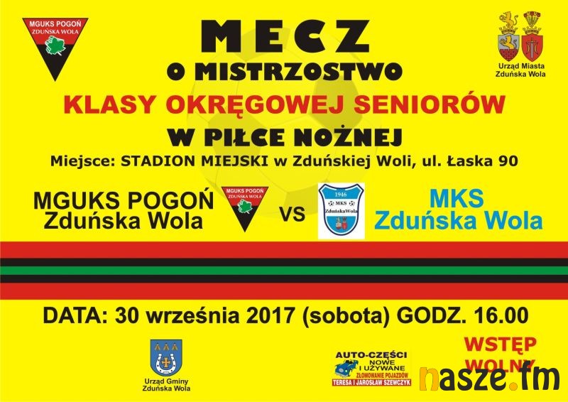 W sobotę mecz jesieni w Zduńskiej woli, czy derby miasta Pogoń - MKS. Mecz zapowiada się szczególnie interesująco, zważywszy na fakt, że obie ekipy plasują się w ścisłej czołówce tabeli sieradzkiej klasy okręgowej. Pogoń jest liderem, a MKS zajmuje 3 miejsce. Po raz ostatni derby rozegrano w czerwcu, wtedy MKS wygrał na boisku Pogoni 3:0. Początek sobotniego pojedynku o 16:00.