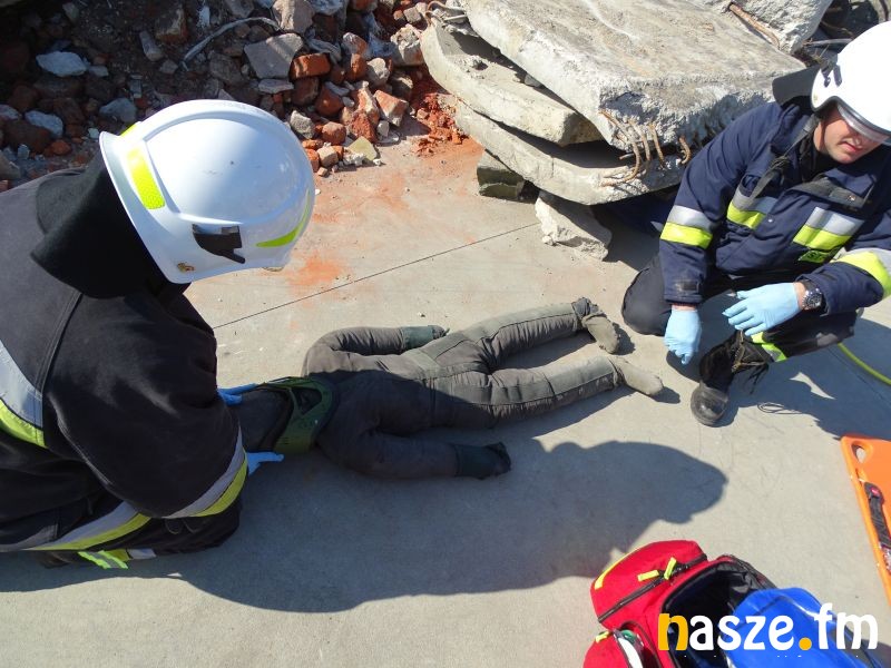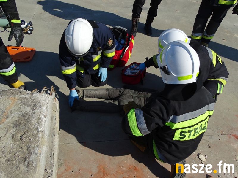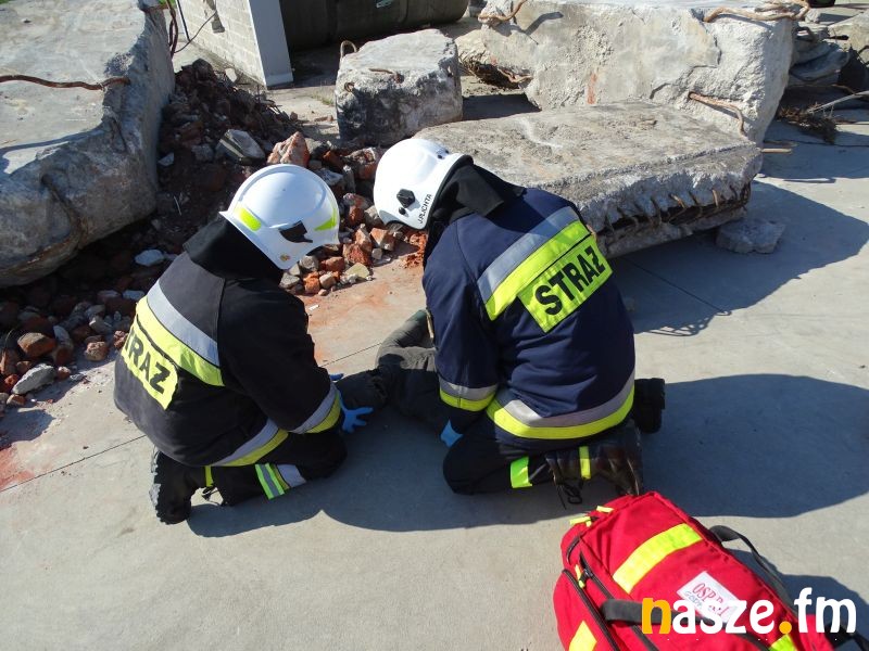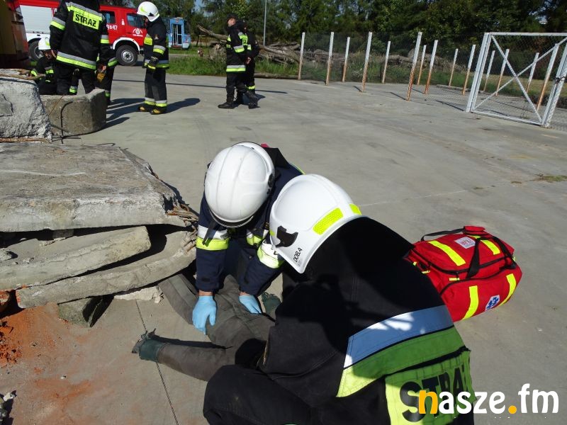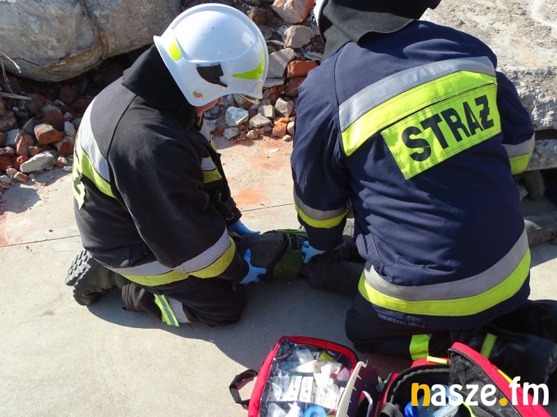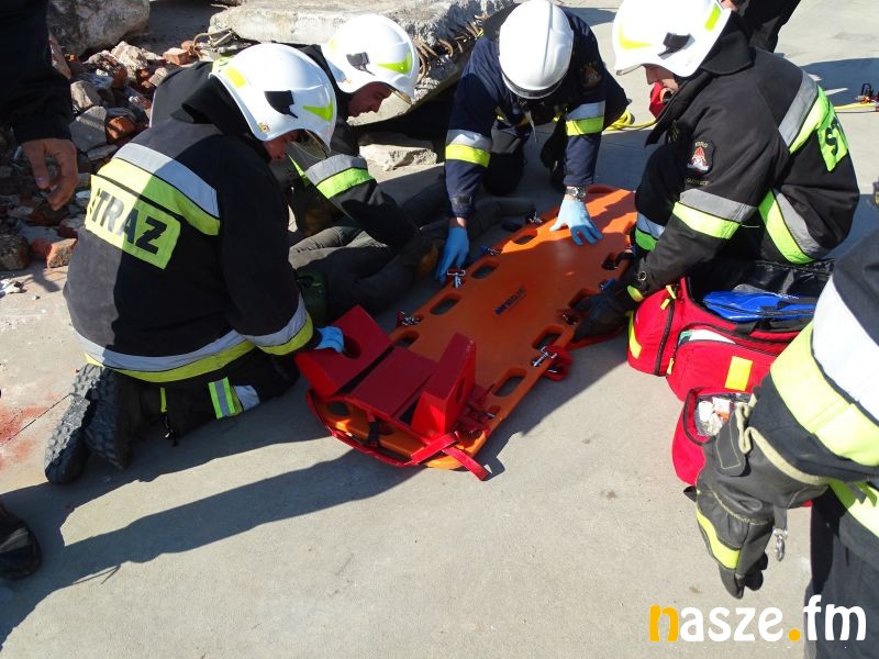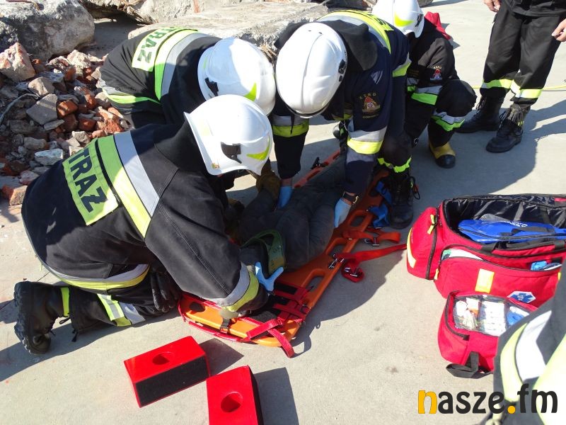- Ćwiczymy w trzech miejscach trzy scenariusze. Tutaj na terenie komendy udzielamy pomocy osobie przygniecionej przez elementy budynku, czyli mamy zawalenie się fragmentu ściany na osobę - mówił kapitan Sławomir Osiewała, zastępca dowódcy Jednostki Ratowniczo-Gaśniczej w Sieradzu.