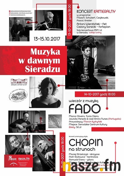 Na sobotę zaplanowano "Wieczór z muzyką fado". Na scenie Teatru Miejskiego pojawią się Marcin Kydryński ( dziennikarz i popularyzator muzyki portugalskiej w naszym kraju ) i zaproszeni przez niego artyści: Marco Oliveira - śpiew i gitara klasyczna, Joao Penedo - gitara basowa, Jose Elmiro Nunes - gitara portugalska, Tania Oleiro - śpiew. Początek o godz. 18:00.Bilety w cenie: 50 zł (do kupienia w kasie SCK ul. Dominikańska 19 oraz na www.scksieradz.pl)