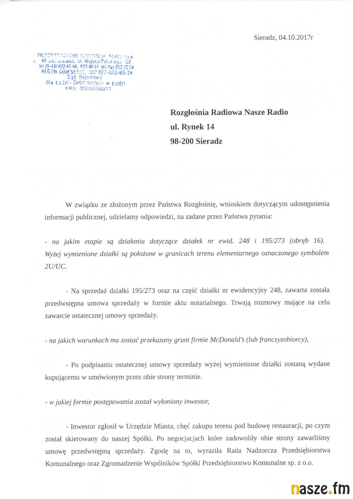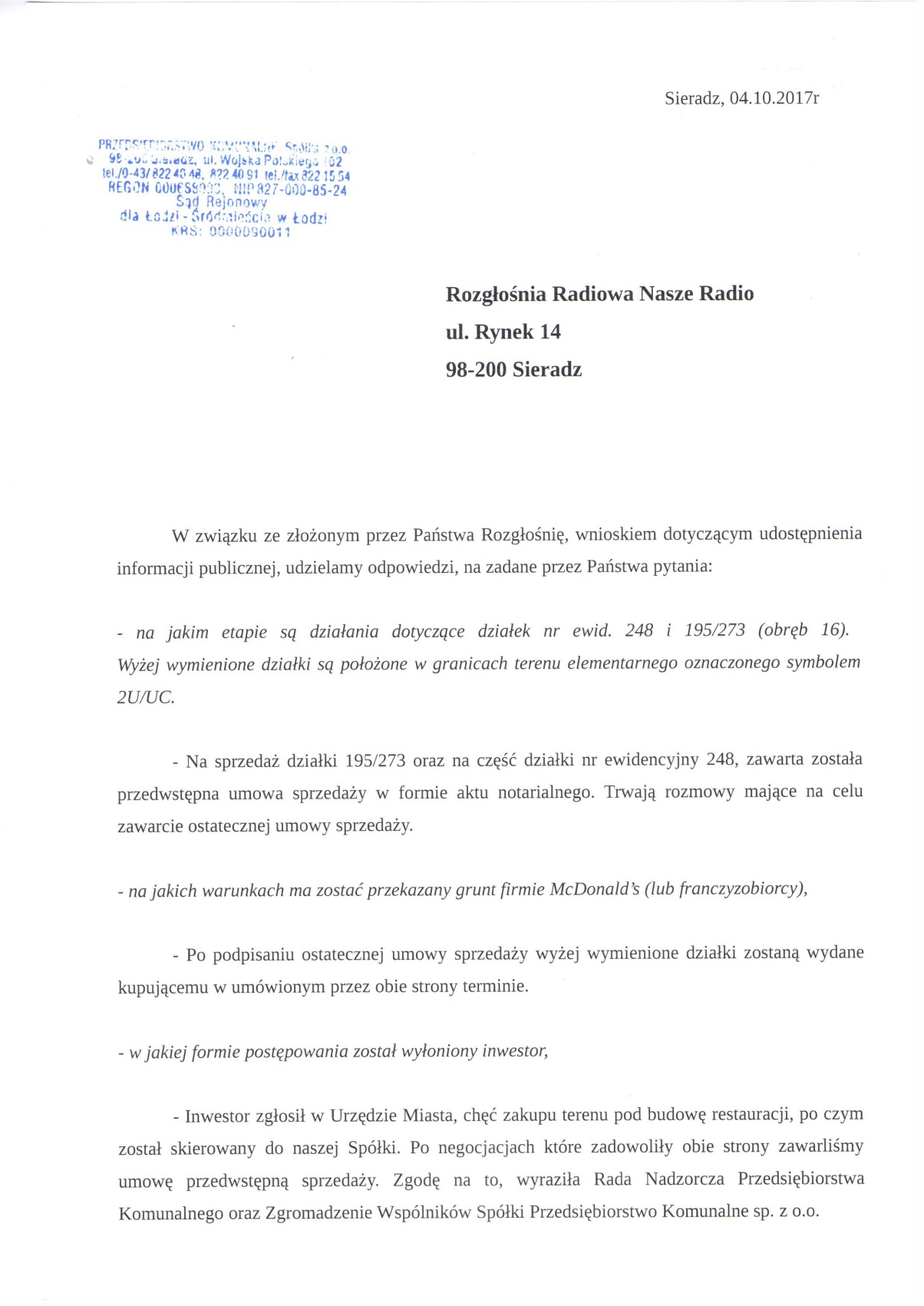 Doczekaliśmy się odpowiedzi od Przedsiębiorstwa Komunalnego w Sieradzu w sprawie budowy restauracji fastfoodowej na działce przy ul. Jana Pawła II i al. Grunwaldzkiej w Sieradzu.