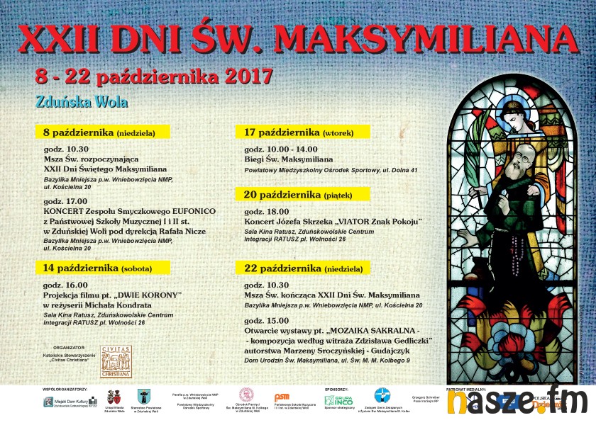 Zbliżają się obchody XXII Dni św. Maksymiliana, patrona Zduńskiej Woli. Uroczystości odbędą się w dniach 8 – 22 października. Ich głównym organizatorem jest Katolickie Stowarzyszenie Civitas Christiana.