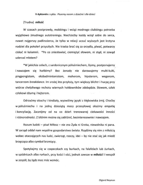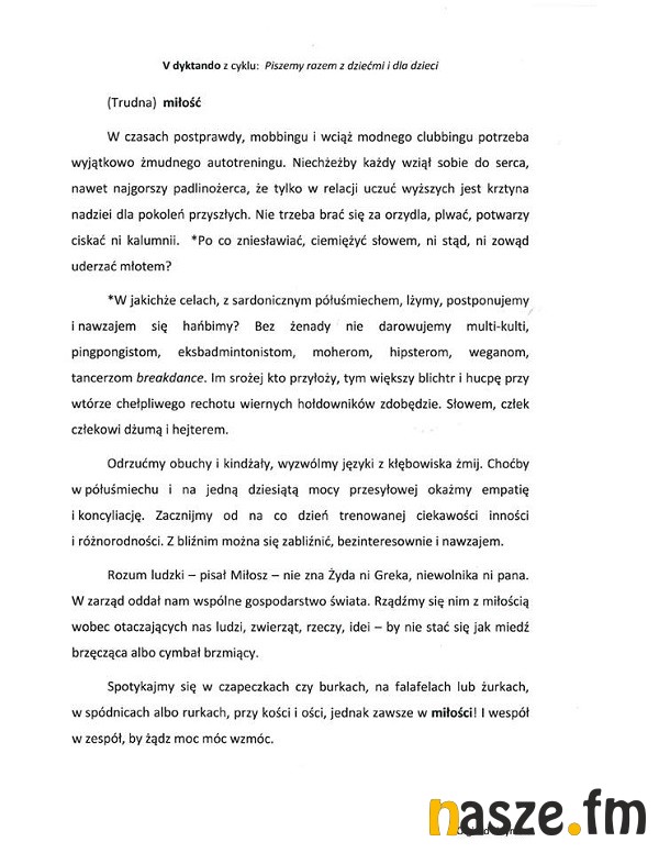 - Podobno dyktando jest trudne, takie mam recenzje od tych osób, które widziały ten tekst, które robiły korektę do tego mojego tekstu, że może lekko przesadzone są stopnie trudności. To jest formuła open, w której uczestniczą wszyscy chętni. Godzi się tutaj odnotować, że pomysłodawczynią i autorką tej koncepcji jest nieżyjąca nauczycielka - Anna Krauze - mówi Olgierd Neyman, filolog polski z Wojewódzkiego Ośrodka Doskonalenia Nauczycieli, autor dyktanda.