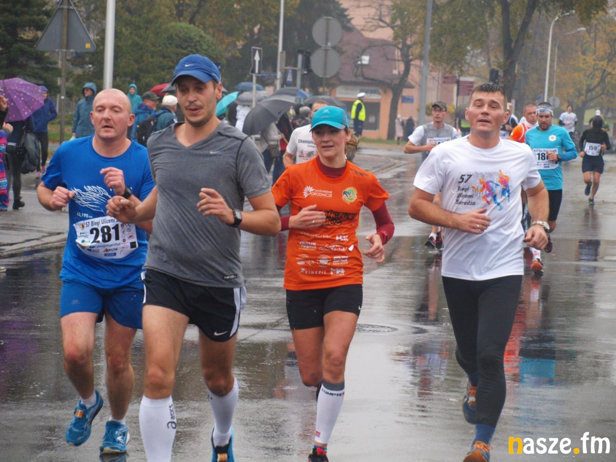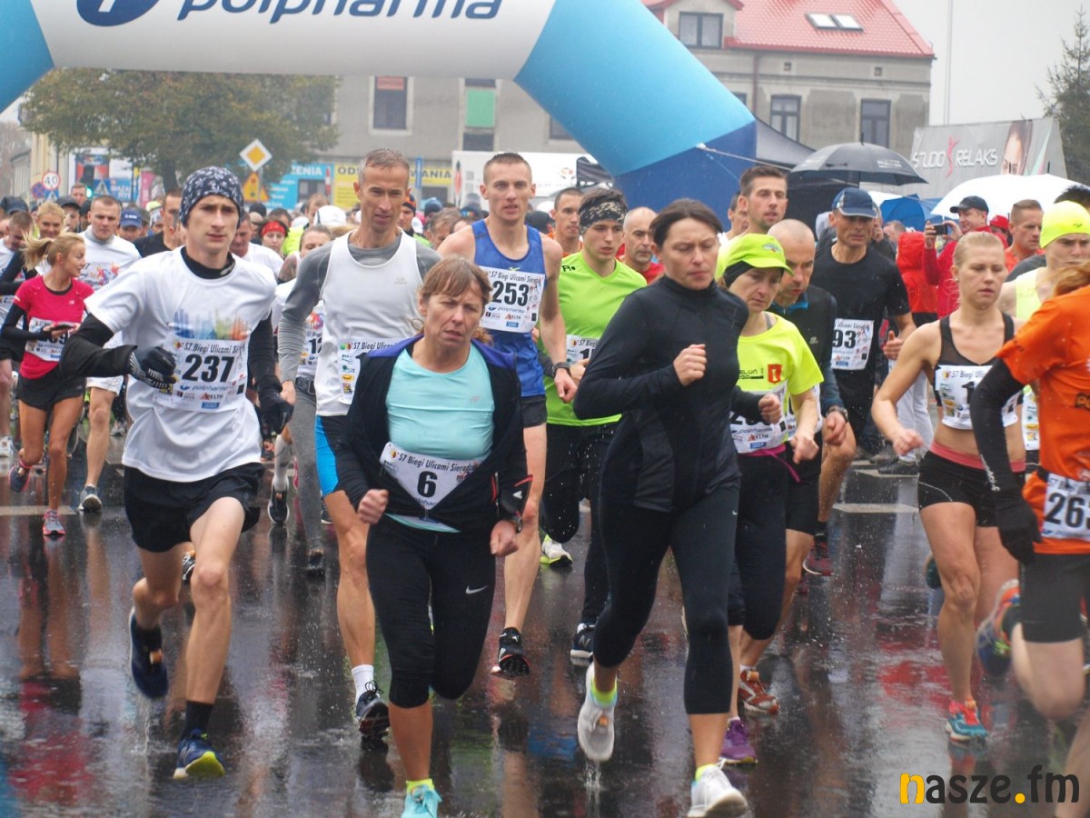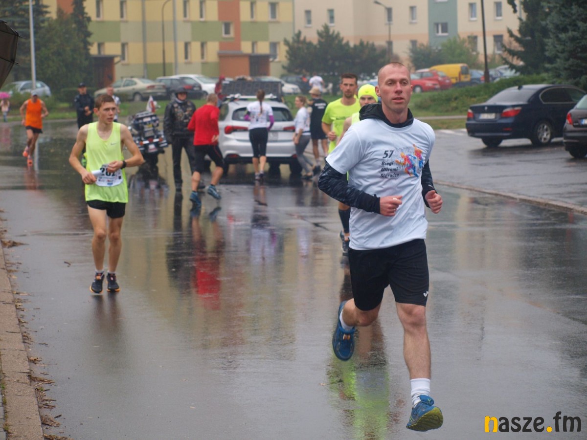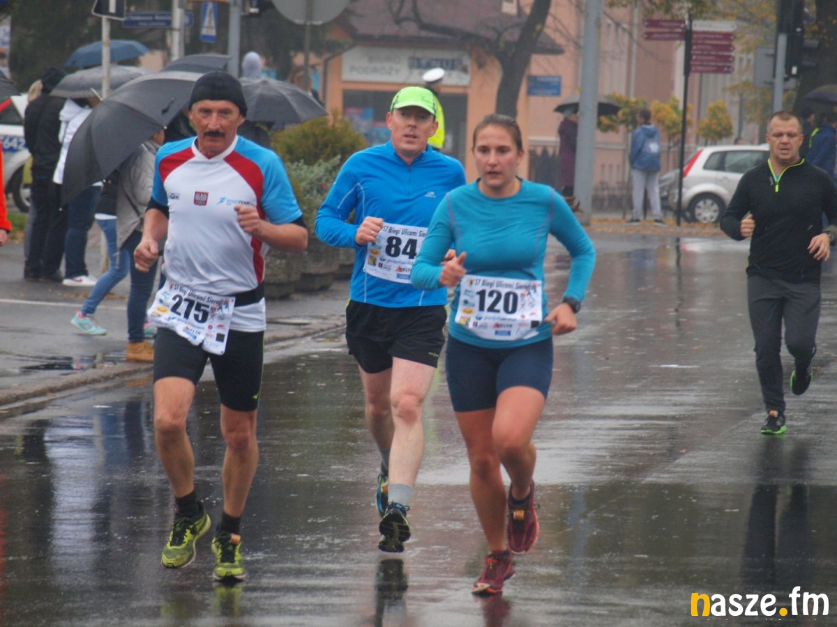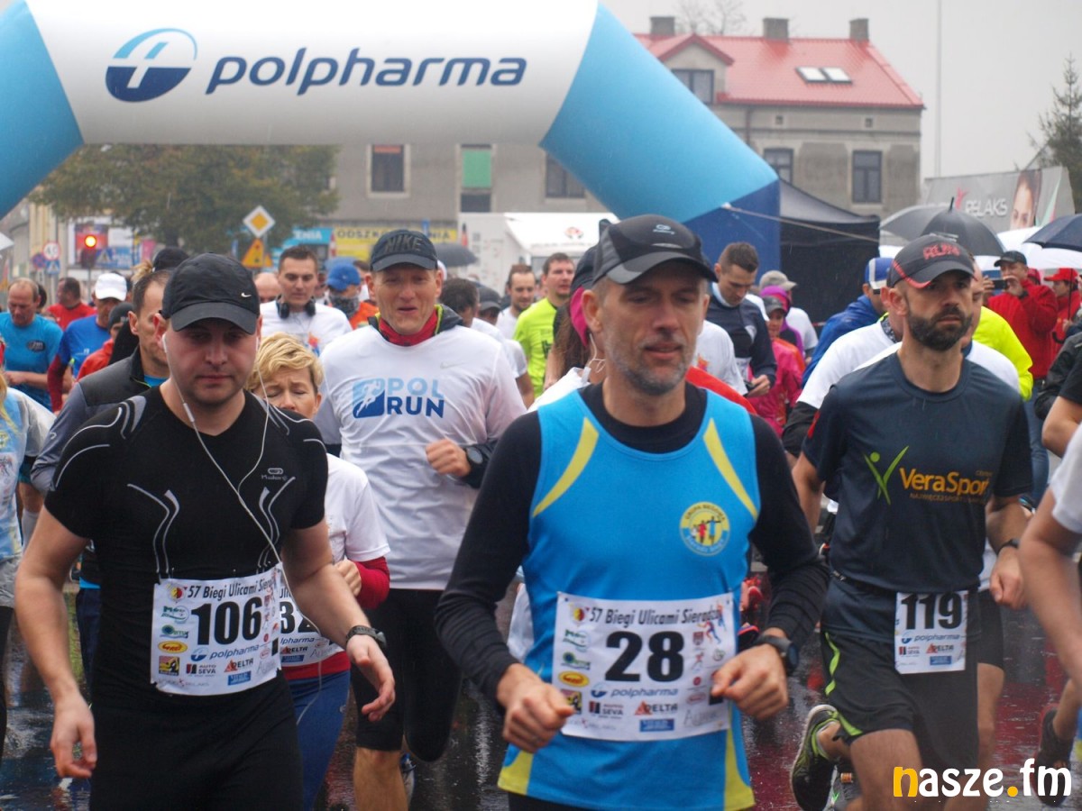 Pogoda nie rozpieszczała uczestników. Deszcz nie mógł jednak odstraszyć prawdziwych miłośników biegania. Jak zwykle największa liczba osób (266) wzięła udział w biegu głównym na dystansie 10 km. Najszybszy na dwóch pięciokilometrowych pętlach był dziś zawodnik RKS Łódź Patryk Stypułkowski, który tym samym poprawił swoje ubiegłoroczne osiągnięcie, przegrał wtedy ze swoim klubowym kolegą Tomaszem Osmulskim. Triumfator 57. edycji Biegów Ulicami Sieradza uzyskał czas 32:35 min, i wyprzedził drugiego na mecie Jędrzeja Hasiurę (także RKS) o blisko półtorej minuty. Jako trzeci linię mety minął wychowanek MULKS MOS Sieradz, obecnie także zawodnik RKS Maciej Nitka. Wśród pań najszybsza była dziś Ewelina Bartocha z Lisowa, która wynikiem 41:51 poprawiła rekord życiowy. Na podium w kategorii kobiet stanęły ponad to: Magdalena Włodarczyk (Wieluń Biega) i Arleta Matysiak (RajSport Active).