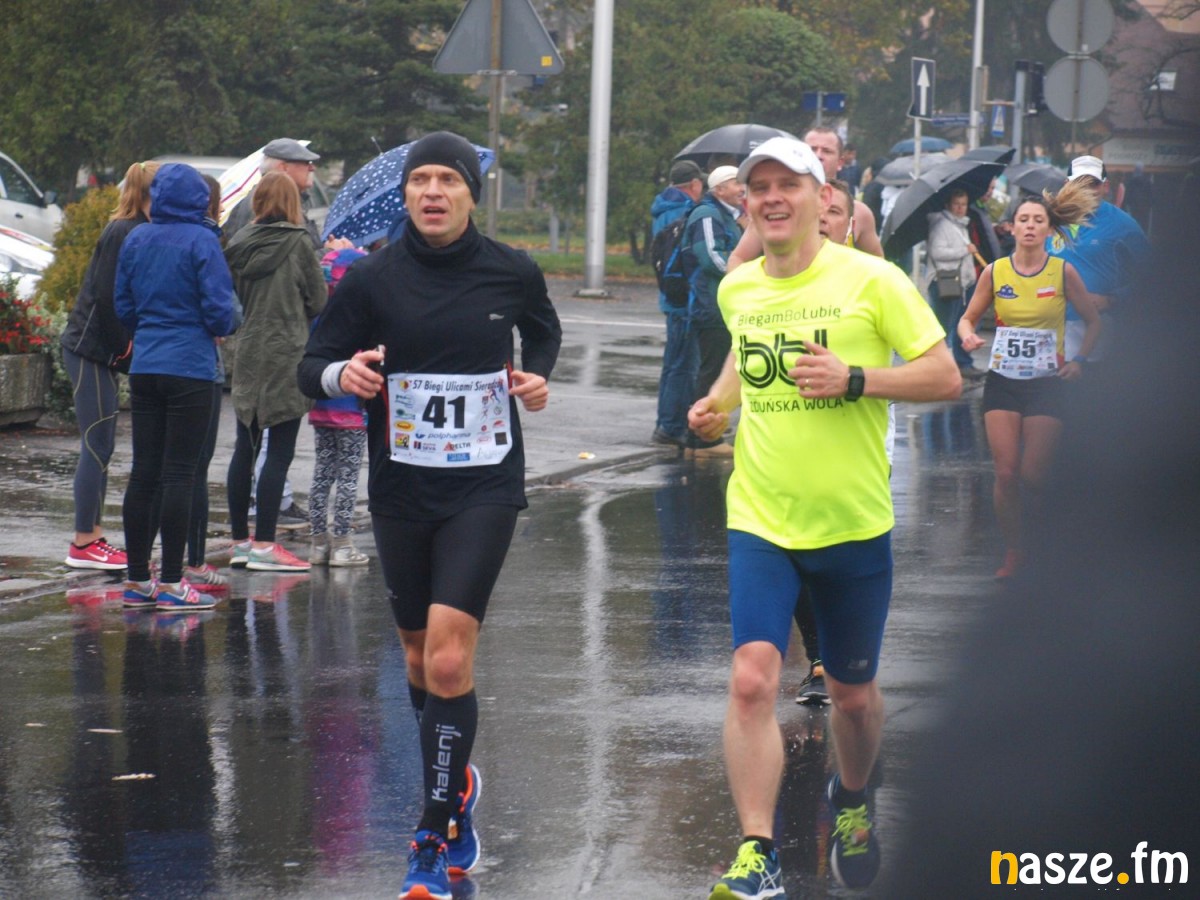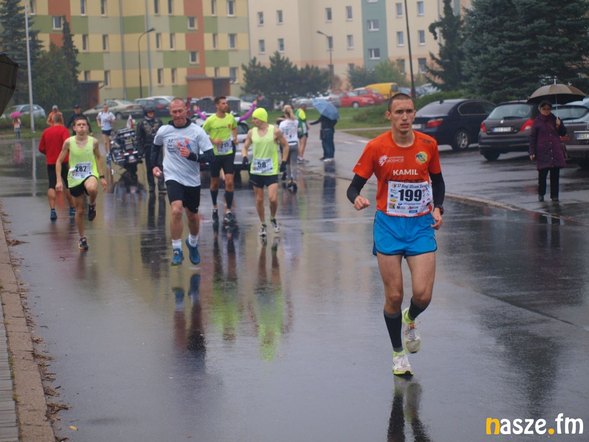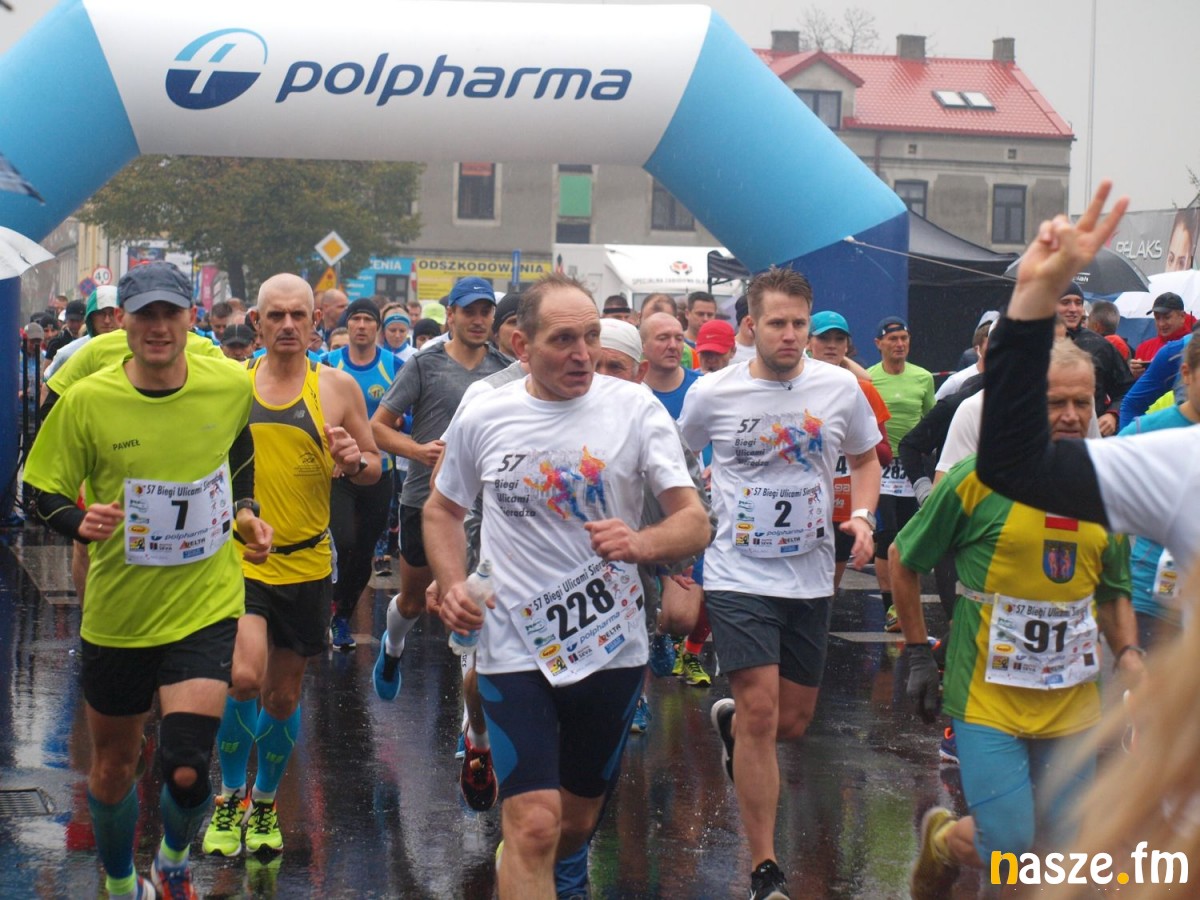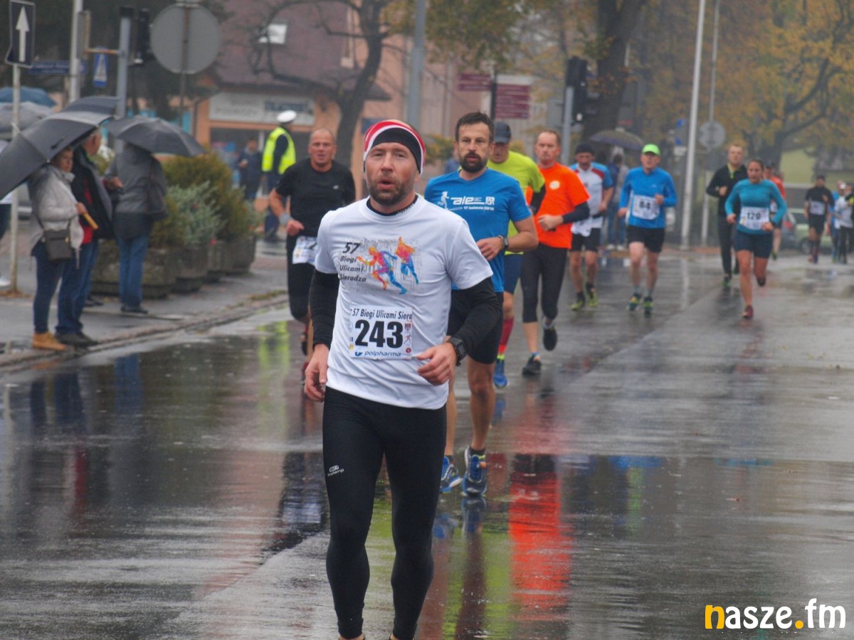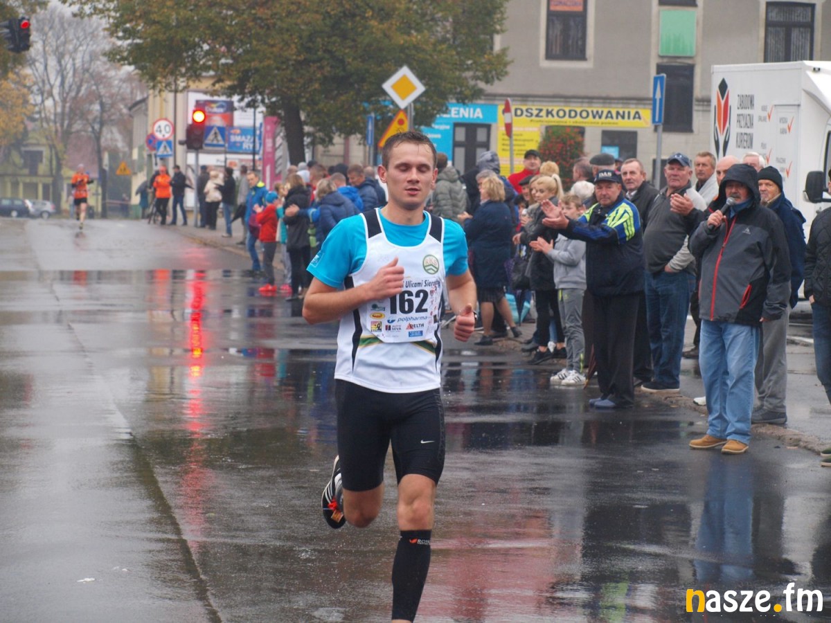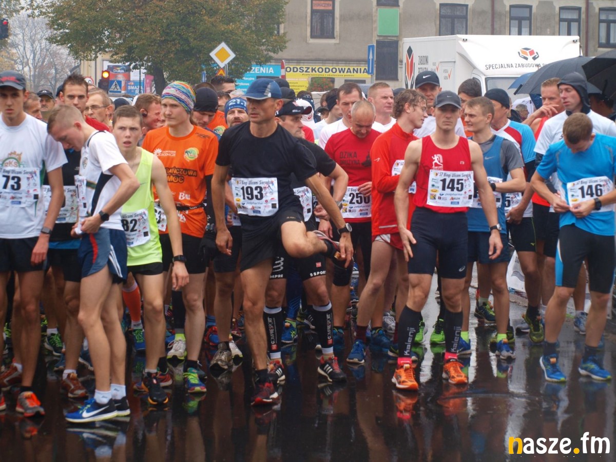Pogoda nie rozpieszczała uczestników. Deszcz nie mógł jednak odstraszyć prawdziwych miłośników biegania. Jak zwykle największa liczba osób (266) wzięła udział w biegu głównym na dystansie 10 km. Najszybszy na dwóch pięciokilometrowych pętlach był dziś zawodnik RKS Łódź Patryk Stypułkowski, który tym samym poprawił swoje ubiegłoroczne osiągnięcie, przegrał wtedy ze swoim klubowym kolegą Tomaszem Osmulskim. Triumfator 57. edycji Biegów Ulicami Sieradza uzyskał czas 32:35 min, i wyprzedził drugiego na mecie Jędrzeja Hasiurę (także RKS) o blisko półtorej minuty. Jako trzeci linię mety minął wychowanek MULKS MOS Sieradz, obecnie także zawodnik RKS Maciej Nitka. Wśród pań najszybsza była dziś Ewelina Bartocha z Lisowa, która wynikiem 41:51 poprawiła rekord życiowy. Na podium w kategorii kobiet stanęły ponad to: Magdalena Włodarczyk (Wieluń Biega) i Arleta Matysiak (RajSport Active).