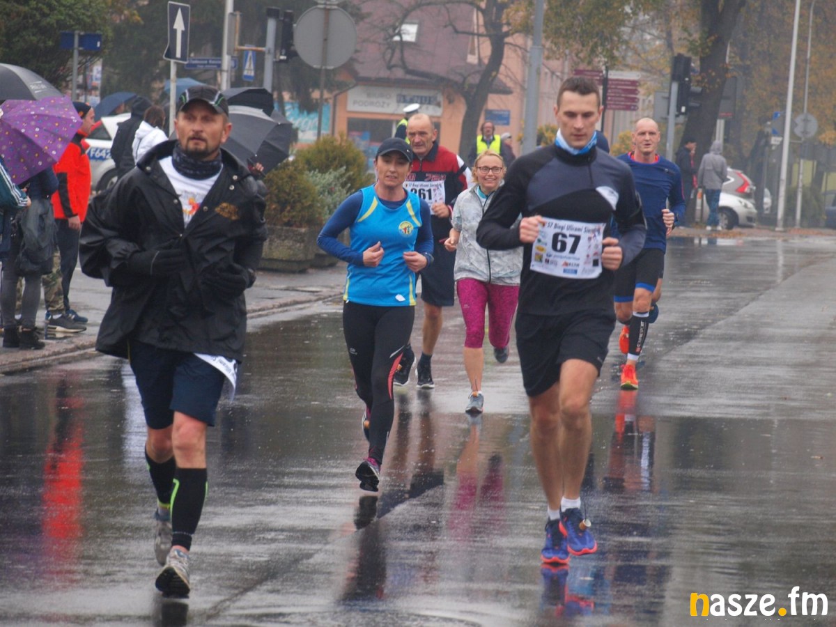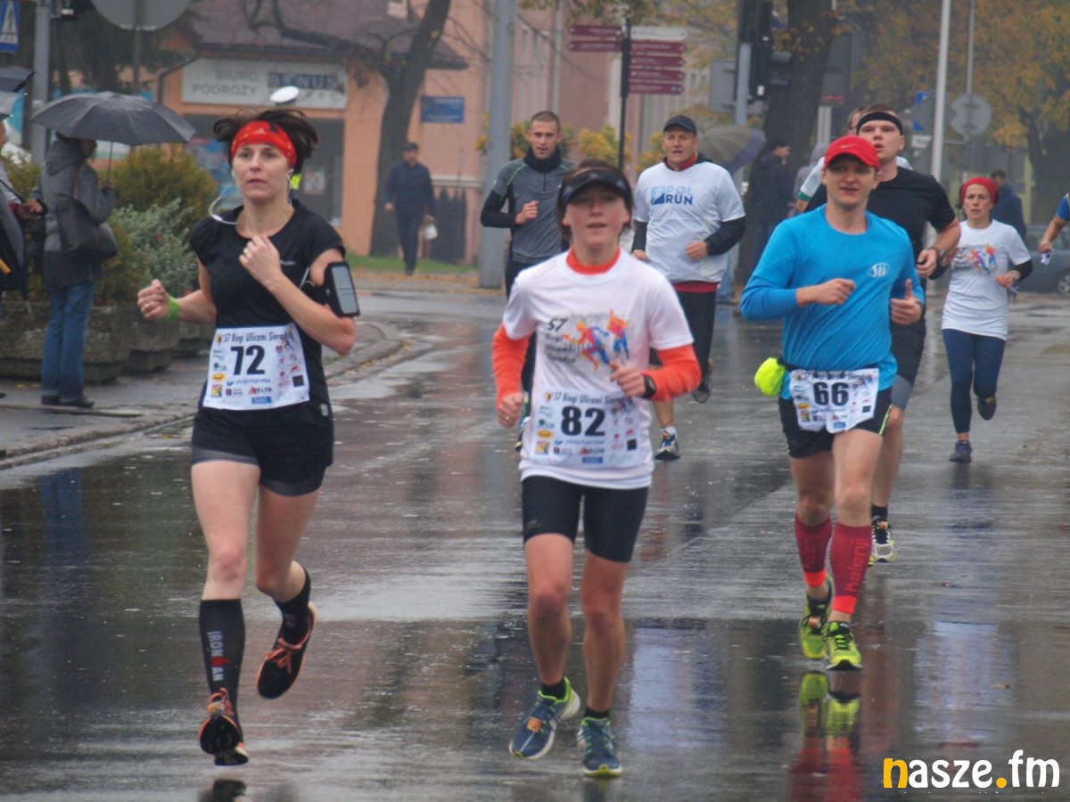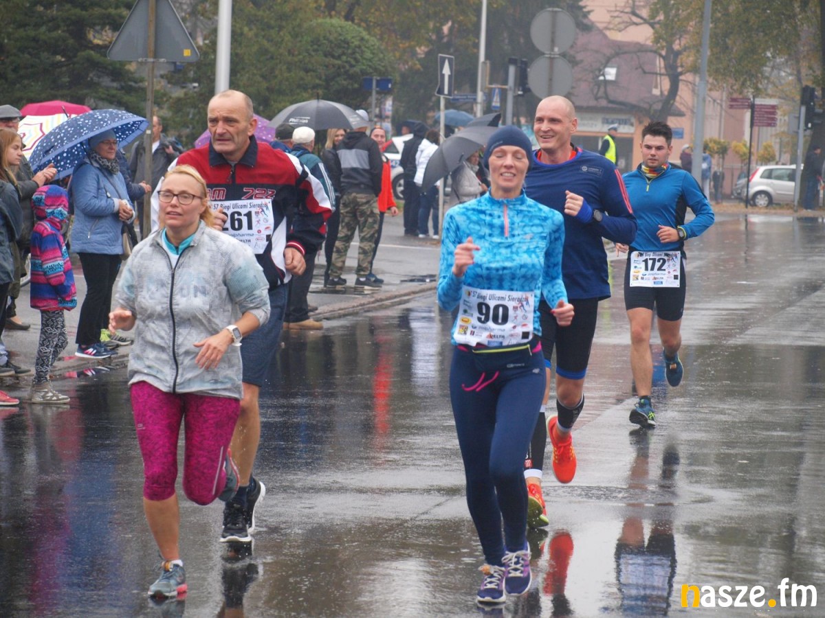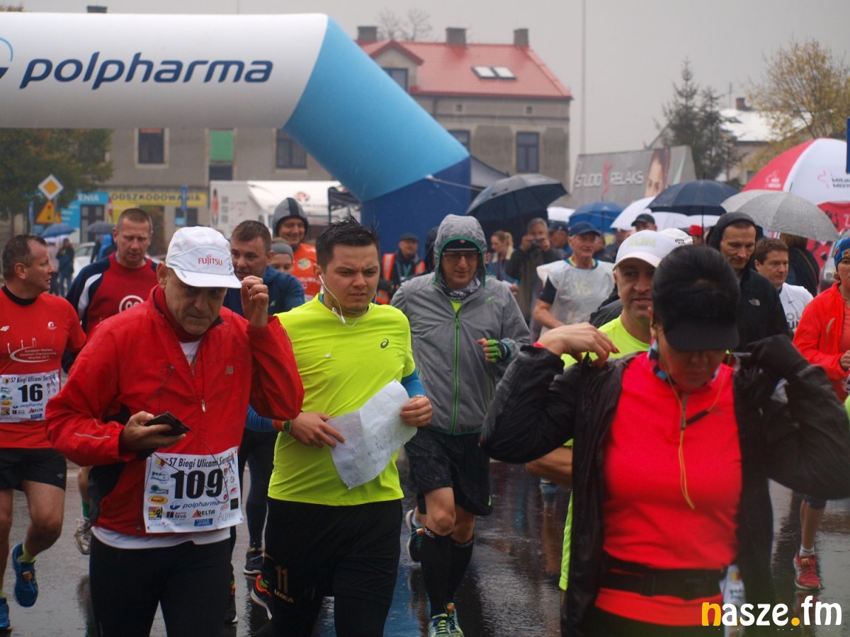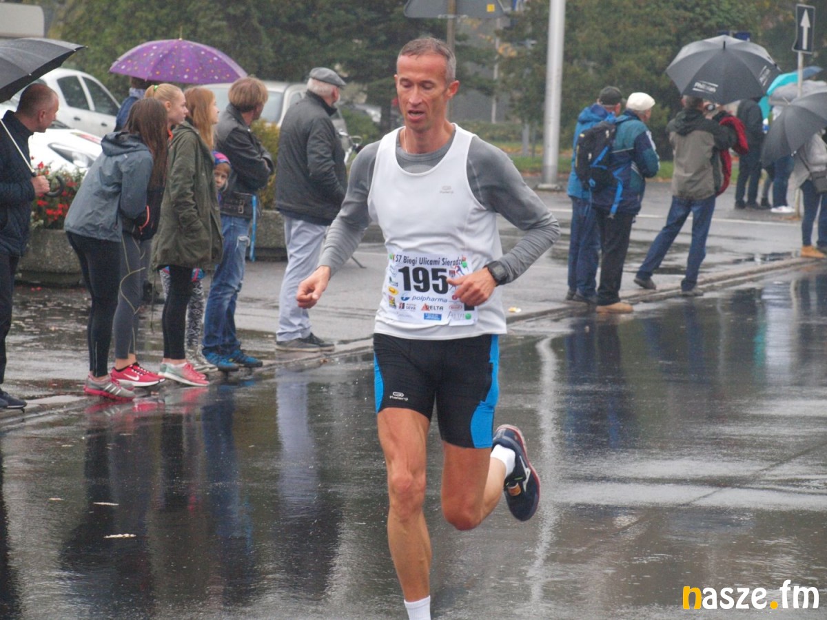 Pogoda nie rozpieszczała uczestników. Deszcz nie mógł jednak odstraszyć prawdziwych miłośników biegania. Jak zwykle największa liczba osób (266) wzięła udział w biegu głównym na dystansie 10 km. Najszybszy na dwóch pięciokilometrowych pętlach był dziś zawodnik RKS Łódź Patryk Stypułkowski, który tym samym poprawił swoje ubiegłoroczne osiągnięcie, przegrał wtedy ze swoim klubowym kolegą Tomaszem Osmulskim. Triumfator 57. edycji Biegów Ulicami Sieradza uzyskał czas 32:35 min, i wyprzedził drugiego na mecie Jędrzeja Hasiurę (także RKS) o blisko półtorej minuty. Jako trzeci linię mety minął wychowanek MULKS MOS Sieradz, obecnie także zawodnik RKS Maciej Nitka. Wśród pań najszybsza była dziś Ewelina Bartocha z Lisowa, która wynikiem 41:51 poprawiła rekord życiowy. Na podium w kategorii kobiet stanęły ponad to: Magdalena Włodarczyk (Wieluń Biega) i Arleta Matysiak (RajSport Active).