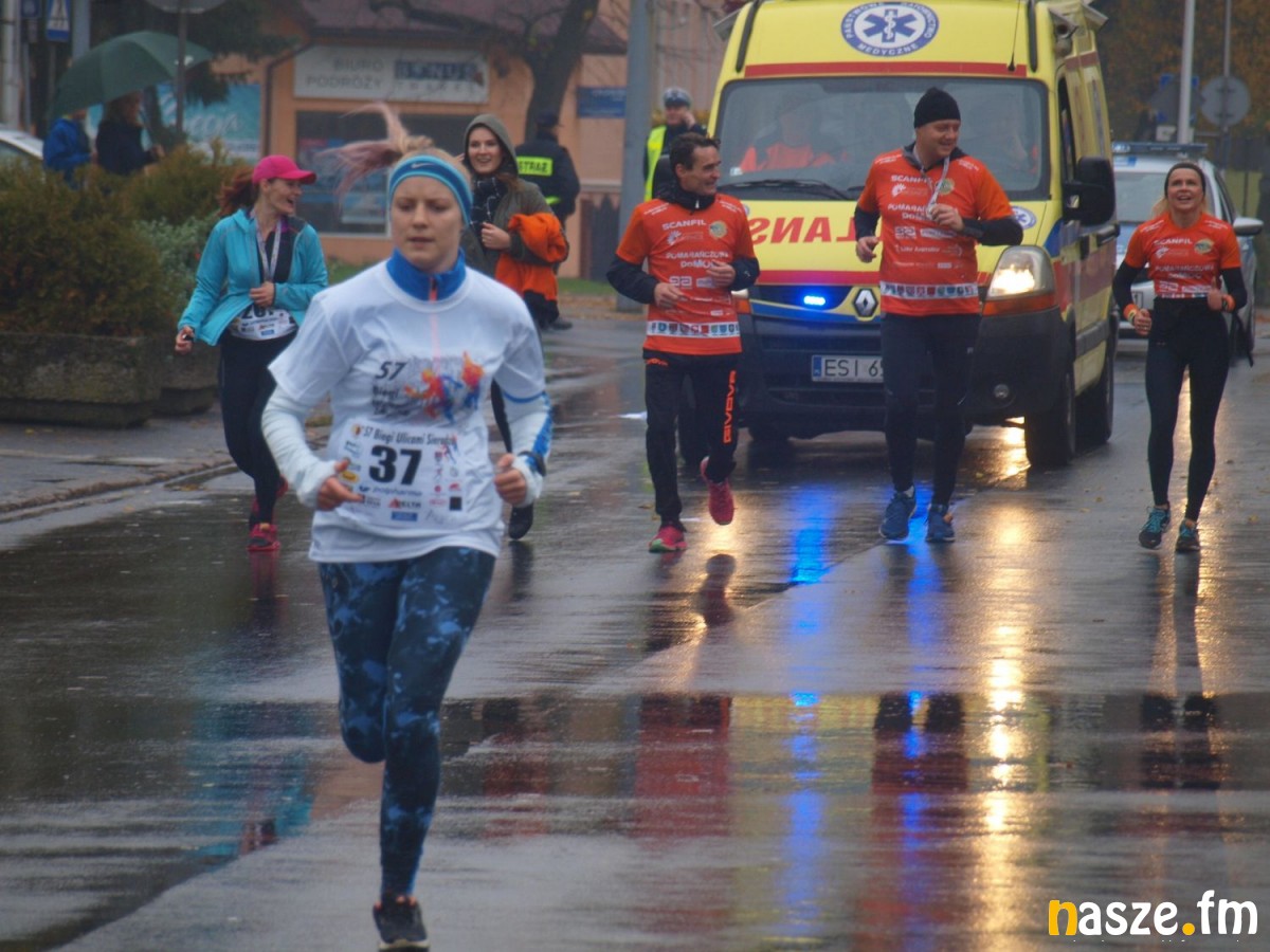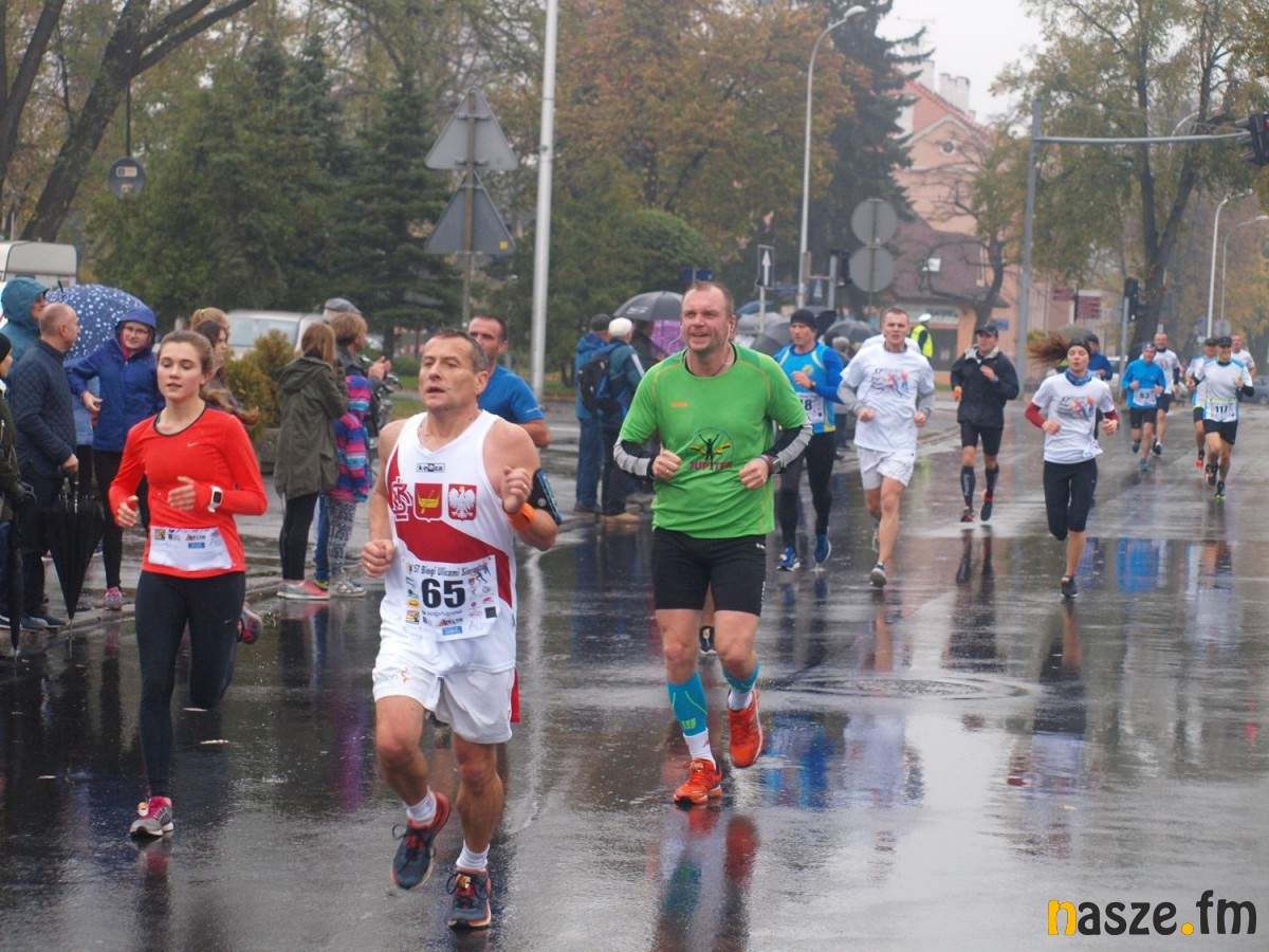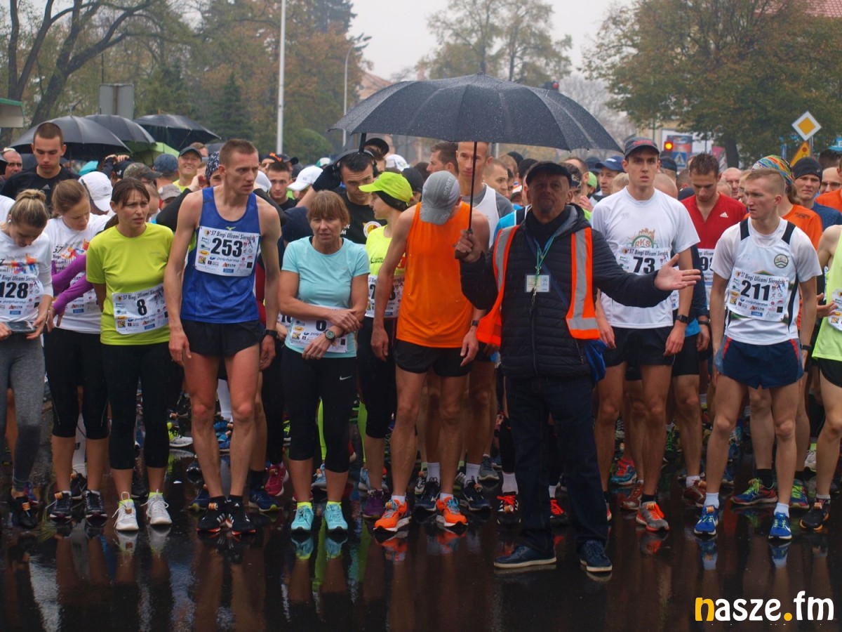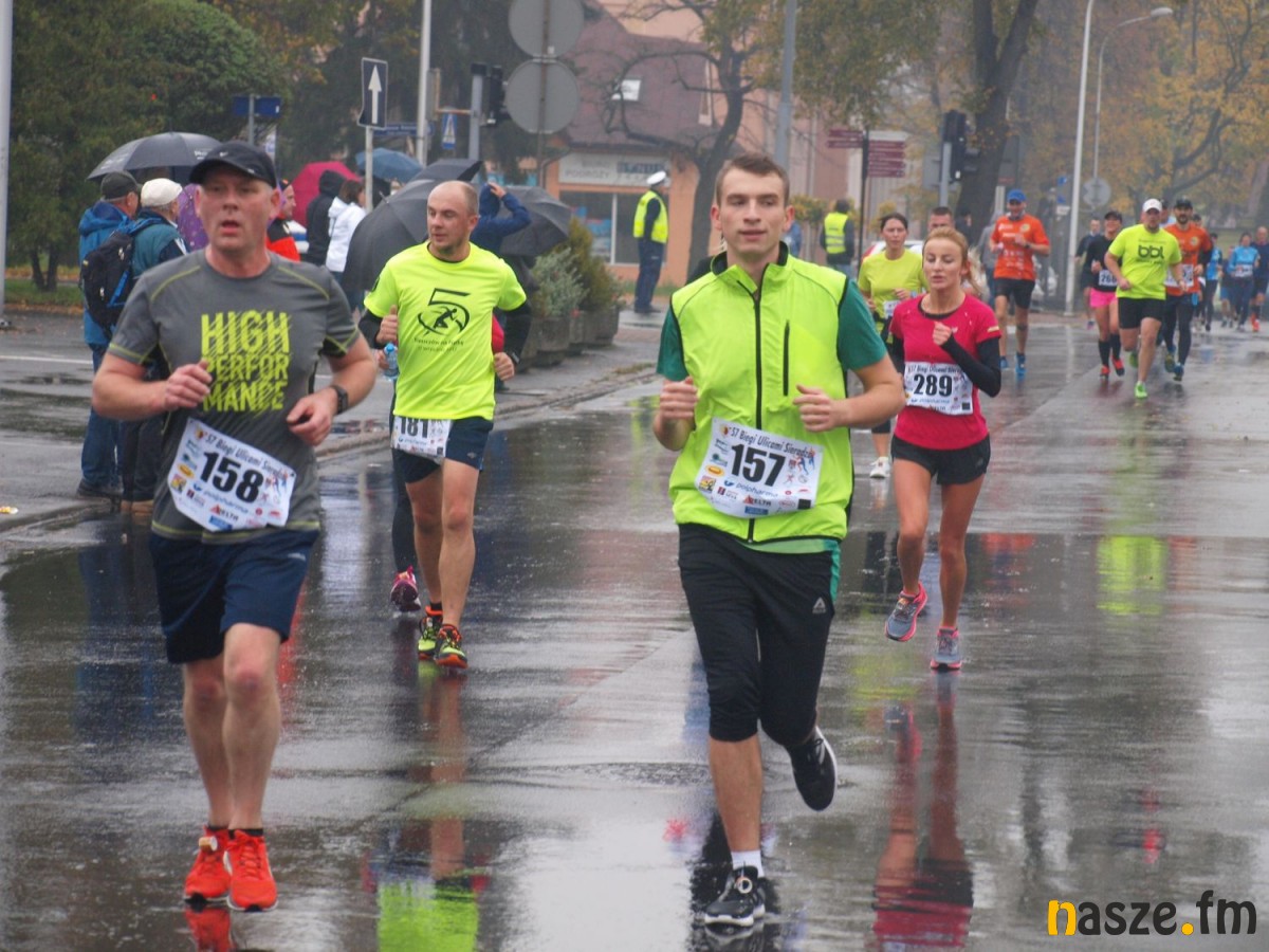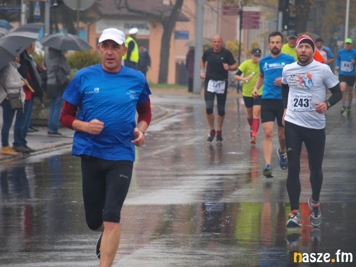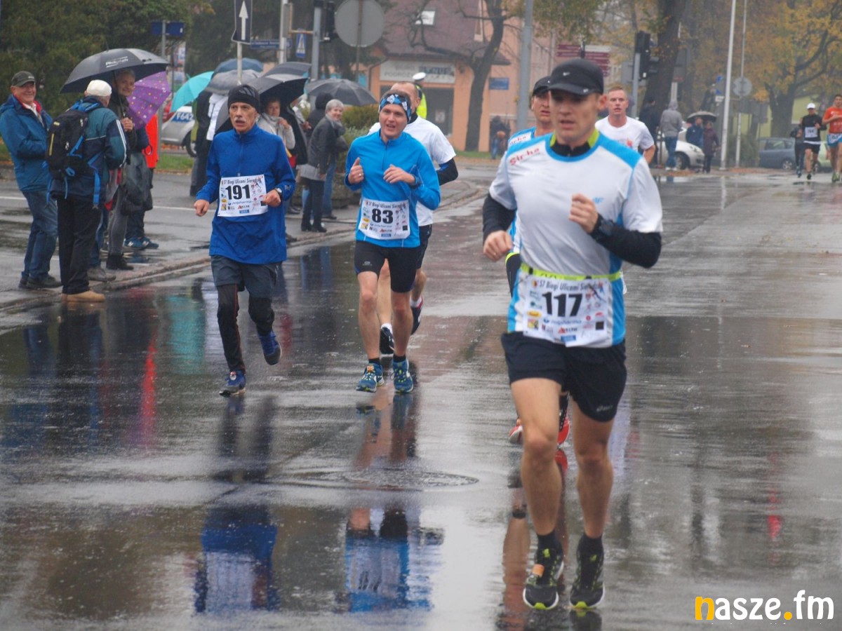 Pogoda nie rozpieszczała uczestników. Deszcz nie mógł jednak odstraszyć prawdziwych miłośników biegania. Jak zwykle największa liczba osób (266) wzięła udział w biegu głównym na dystansie 10 km. Najszybszy na dwóch pięciokilometrowych pętlach był dziś zawodnik RKS Łódź Patryk Stypułkowski, który tym samym poprawił swoje ubiegłoroczne osiągnięcie, przegrał wtedy ze swoim klubowym kolegą Tomaszem Osmulskim. Triumfator 57. edycji Biegów Ulicami Sieradza uzyskał czas 32:35 min, i wyprzedził drugiego na mecie Jędrzeja Hasiurę (także RKS) o blisko półtorej minuty. Jako trzeci linię mety minął wychowanek MULKS MOS Sieradz, obecnie także zawodnik RKS Maciej Nitka. Wśród pań najszybsza była dziś Ewelina Bartocha z Lisowa, która wynikiem 41:51 poprawiła rekord życiowy. Na podium w kategorii kobiet stanęły ponad to: Magdalena Włodarczyk (Wieluń Biega) i Arleta Matysiak (RajSport Active).