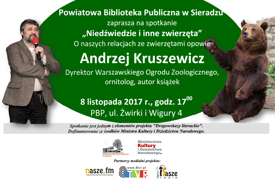 Spotkanie z Andrzejem Kruszewiczem rozpocznie się o godz. 17:00, wstęp wolny. Jest organizowane w ramach projektu "Drogowskazy literackie". Dofinansowane ze środków Ministra Kultury i Dziedzictwa Narodowego.