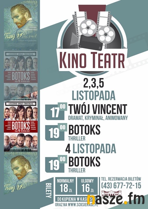 Od 2 do 5 listopada w Sieradzkim Centrum Kultury będziecie mogli obejrzeć dwie produkcje filmowe. Będą to animacja "Twój Vincent" oraz polska thriller "Botoks". Bilety do nabycia w kasie sieradzkiego Kina Teatr.
