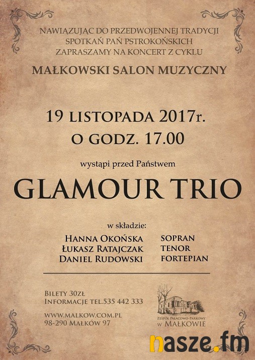 W pałacu w Małkowie na niedzielę 19 listopada zaplanowano pierwszy koncert nawiązujący do salonów organizowanych na początku minionego stulecia przez Walentynę i Marię Pstrokońskie. Wystąpi Glamour Trio, w którym śpiewa Hanna Okońska.