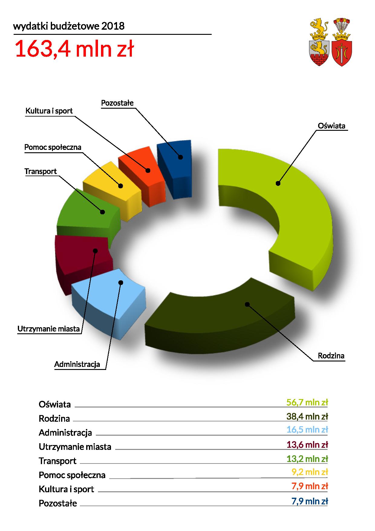 W projekcie budżetu przewidziano wydatki na poziomie 163,4 mln zł, z czego najwięcej pochłonie oświata - 56,7 mln zł oraz dział rodzina (program Rodzina 500 Plus) - 38,4 mln zł.