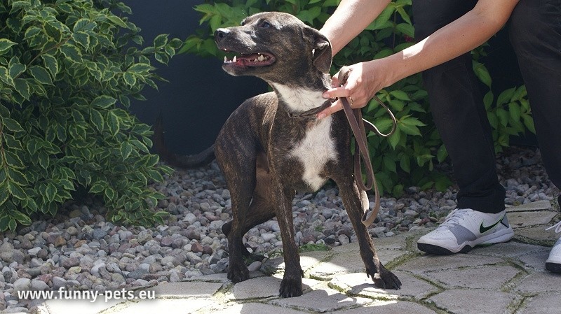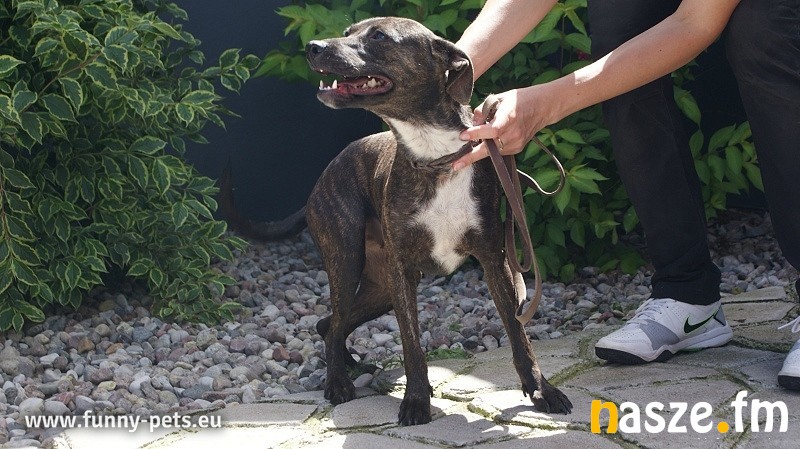 - To 1,5 roczna suczka w typie amstaffa. Jednak jest miniaturką tej rasy, uwielbia spacery, kocha ludzi, pokazuje to przytulając się i wskakując na kolana. Uwielbia spacery i idealnie sprawdzi się w domu z dziećmi - mówi Aneta Świniarska, pracownik schroniska w Czartkach.