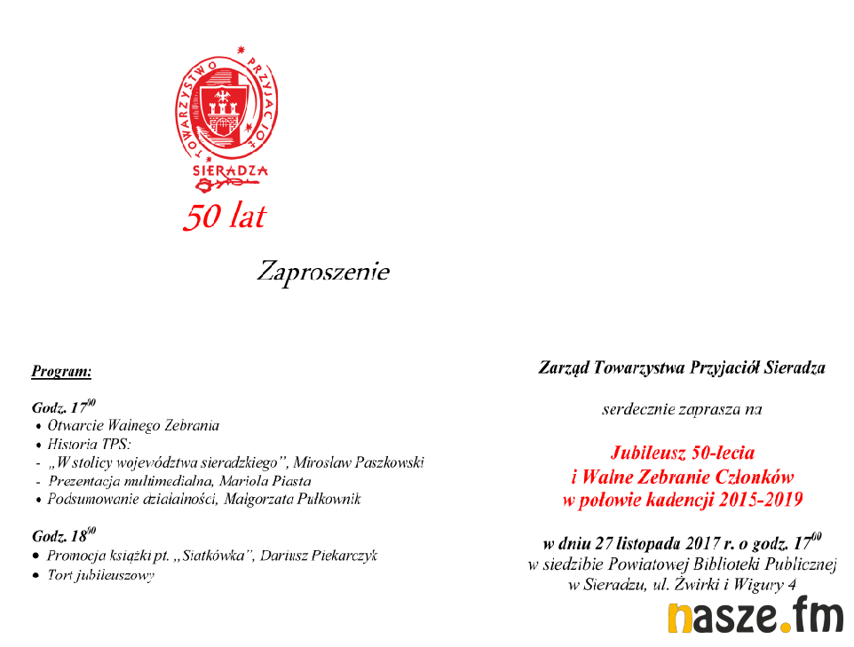 Zarząd TPS zaprasza 27 listopada na Jubileusz 50-lecia i Walne Zebranie Członków w połowie kadencji 2015-2019.