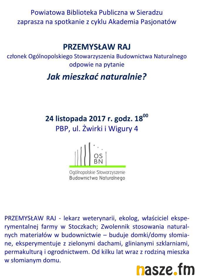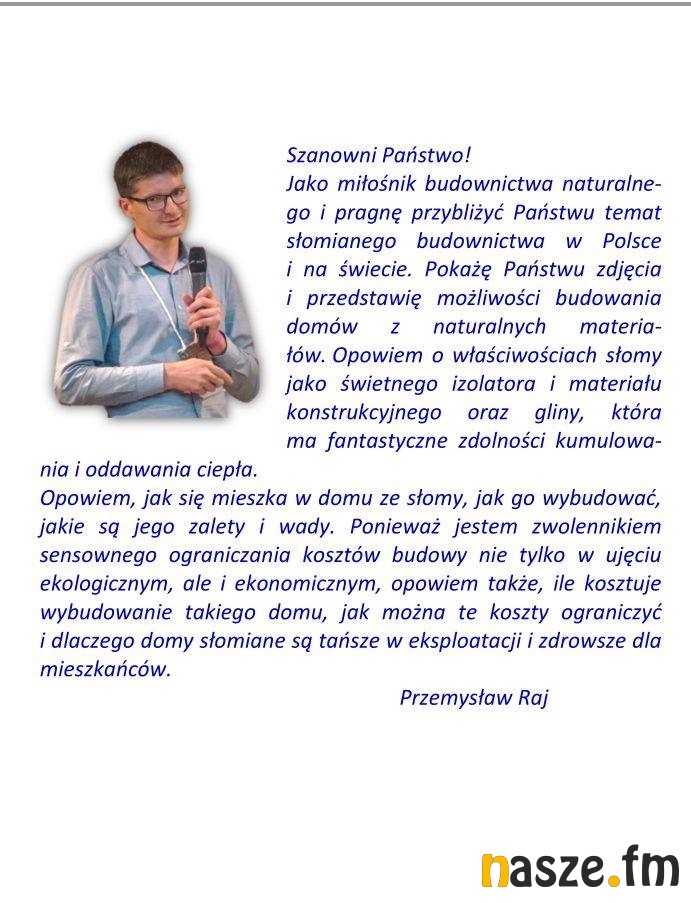 - Domy naturalne, to takie, które zbudowane są z komponentów pochodzenia naturalnego, jak najmniej przetworzonych, takich jak: drewno, słoma, glina, czy tynki wapienne. Korzyści z mieszkania w takim domu jest wiele. Przede wszystkim zdrowotne; tynk z gliny inaczej jonizuje powietrze, niż tynk betonowy, poza tym glina wchłania nadmiar wilgoci z pomieszczenia. Mogę zapewnić, że nasi goście śpią w naszym domu jak zabici - dodaje Przemysław Raj, który od kilku lat mieszka w domu naturalnym, który z resztą sam zbudował. Swoją wiedzą i doświadczeniem chętnie dzieli się z innymi, stąd pomysł piątkowego spotkania w bibliotece. Wszyscy zainteresowani budownictwem naturalnym dowiedzą się przede wszystkim, jak oszczędne są domy z gliny i słomy.