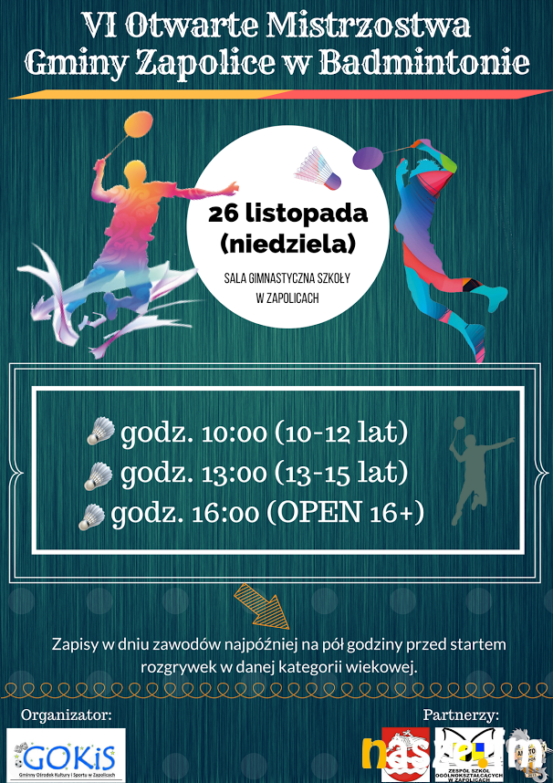 Przed nami 6. edycja Mistrzostw Gminy Zapolice w Badmintonie. Zawody w najbliższą niedzielę (26.11) odbędą się w sali gimnastycznej Szkoły Podstawowej w Zapolicach.