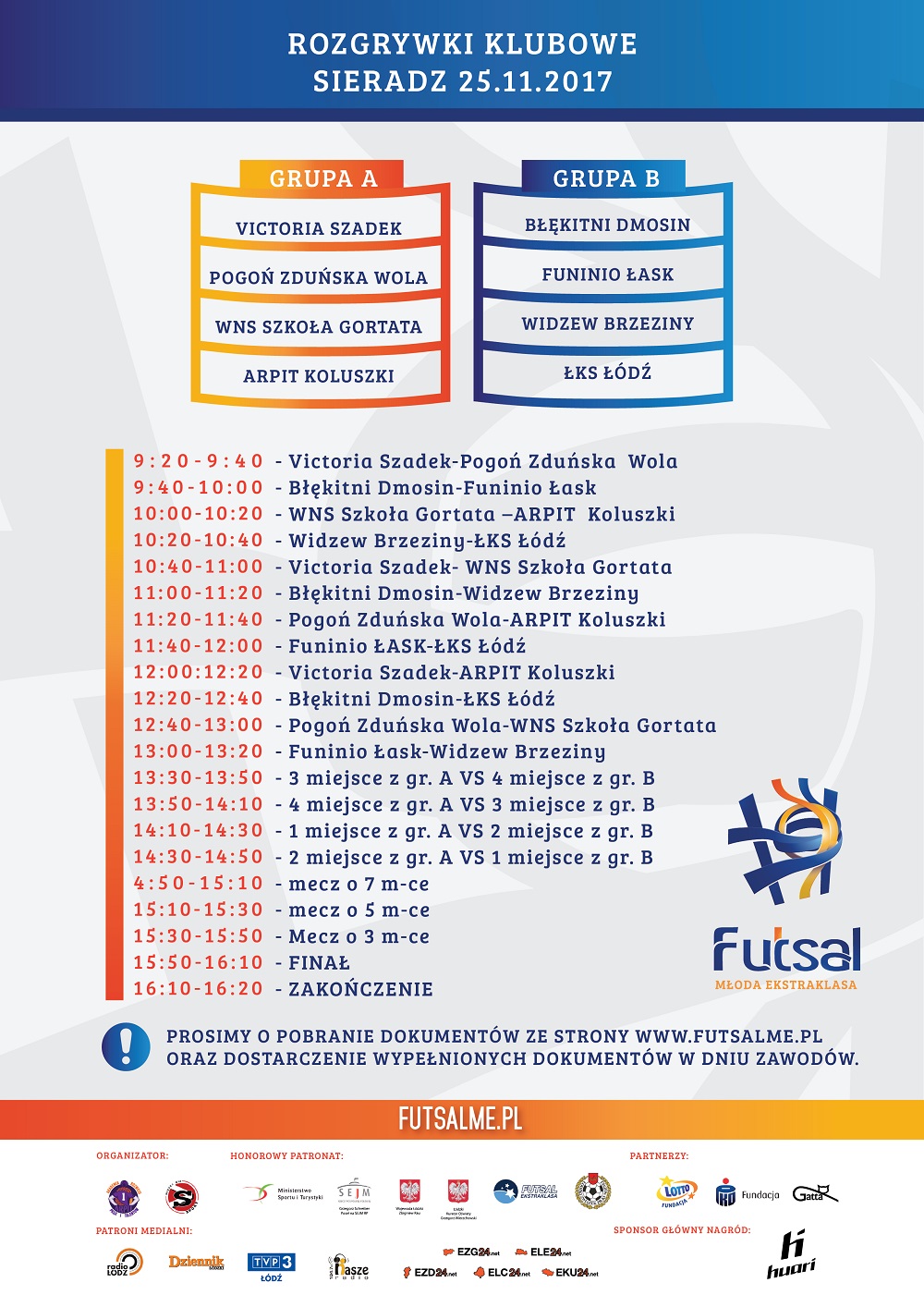 Wszystkie mecze zostaną rozegrane w Zduńskiej Woli w hali SP nr 12 przy ulicy Wileńskiej 3 w niedzielę, początek gier o 10:00.