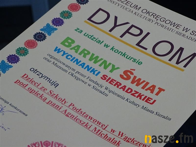 Podstawowej w Charłupi Wielkiej, Mikołaja Kowalczyka (kl. III) z Katolickiej Szkoły Podstawowej w Sieradzu, Łukasza Krysiaka (l.13) ze Szkoły Podstawowej w Charłupi Wielkiej, Justyny Olejnik (l.15) ze Szkoły Podstawowej w Charłupi Wielkiej, Magdaleny Skurtys (l.14) ze Szkoły Podstawowej w Charłupi Wielkiej i Natalii Skweres (l.9) ze Zespołu Placówek Wychowania Pozaszkolnego Jest to dyplom i nagroda rzeczowa w postaci materiałów plastycznych.