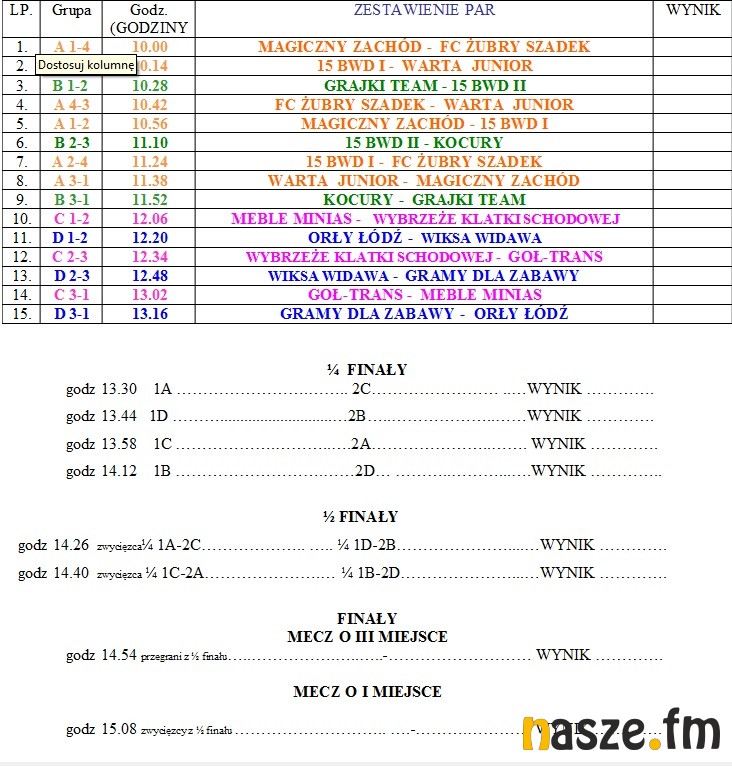 Początek turnieju zaplanowano na godzinę 9:30, a zakończenie o godzinie 16:10.