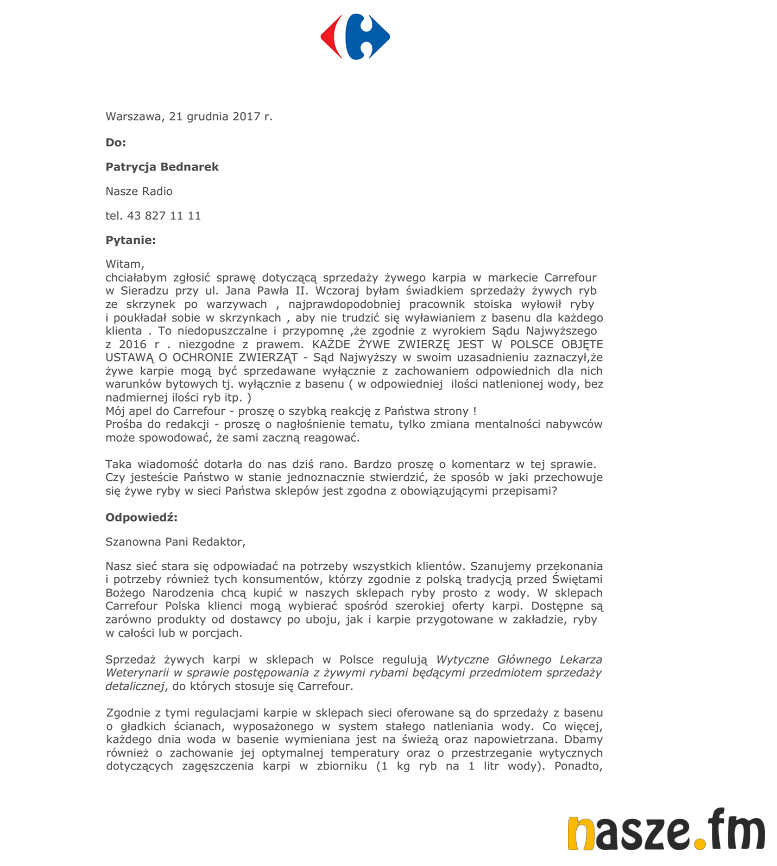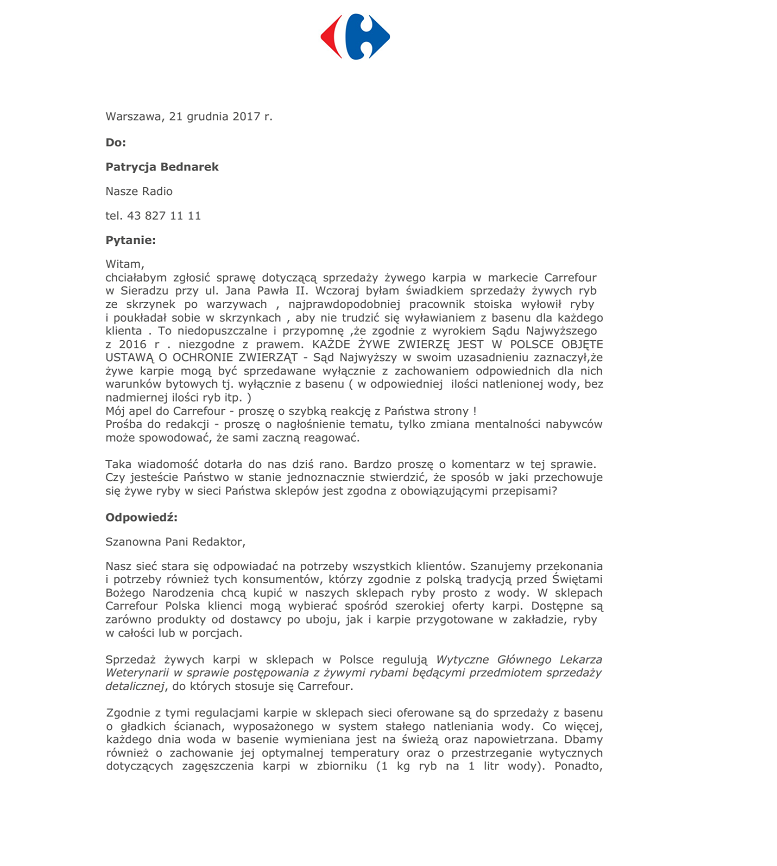 chciałabym zgłosić sprawę dotyczącą sprzedaży żywego karpia w sieradzki markecie ul. Jana Pawła II. Wczoraj byłam świadkiem sprzedaży żywych ryb ze skrzynek po warzywach , najprawdopodobniej pracownik stoiska wyłowił ryby i poukładał sobie w skrzynkach , aby nie trudzić się wyławianiem z basenu dla każdego klienta . To niedopuszczalne i przypomnę ,że zgodnie z wyrokiem Sądu Najwyższego z 2016 r . niezgodne z prawem. KAŻDE ŻYWE ZWIERZĘ JEST W POLSCE OBJĘTE USTAWĄ O OCHRONIE ZWIERZĄT - Sąd Najwyższy w swoim uzasadnieniu zaznaczył ,że żywe karpie mogą być sprzedawane wyłącznie z zachowaniem odpowiednich dla nich warunków bytowych tj. wyłącznie z basenu (w odpowiedniej ilości natlenionej wody , bez nadmiernej ilości ryb itp.)