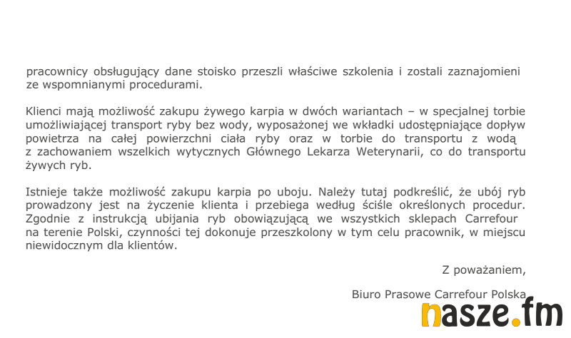 Słuchaczka Naszego Radia zgłosiła się do nas z prośbą o interwencję. Sprawa dotyczy sprzedaży żywego karpia w jednym z sieradzkich marketów. Jak pisze: Wczoraj byłam świadkiem sprzedaży żywych ryb ze skrzynek po warzywach , najprawdopodobniej pracownik stoiska wyłowił ryby i poukładał sobie w skrzynkach , aby nie trudzić się wyławianiem z basenu dla każdego klienta.