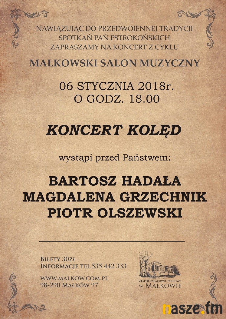 W sobotę 6 stycznia w pałacu w Małkowie będzie można posłuchać tradycyjnych kolęd w jazzowej aranżacji Bartosza Hadały oraz autorskich utworów artysty. Pianiście będą towarzyszyć Magdalena Grzechnik (wokal) i Piotr Olszewski (gitara). Będzie to drugi koncert w ramach Małkowskiego Salonu Muzycznego.