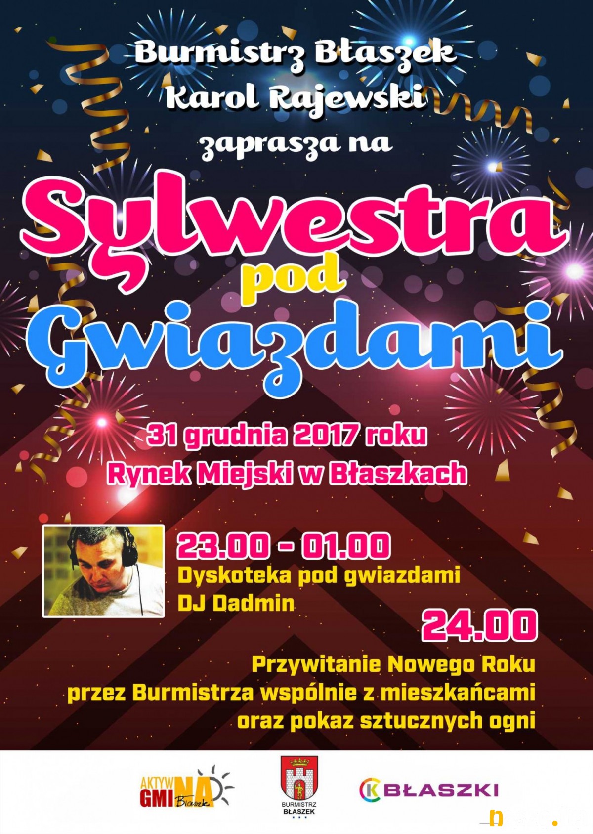 Urząd Miejski w Błaszkach nie rezygnuje z miejskiego sylwestra i zaprasza do wspólnej zabawy pod gwiazdami. W programie zabawa z DJ-em, życzenia i pokaz sztucznych ogni.